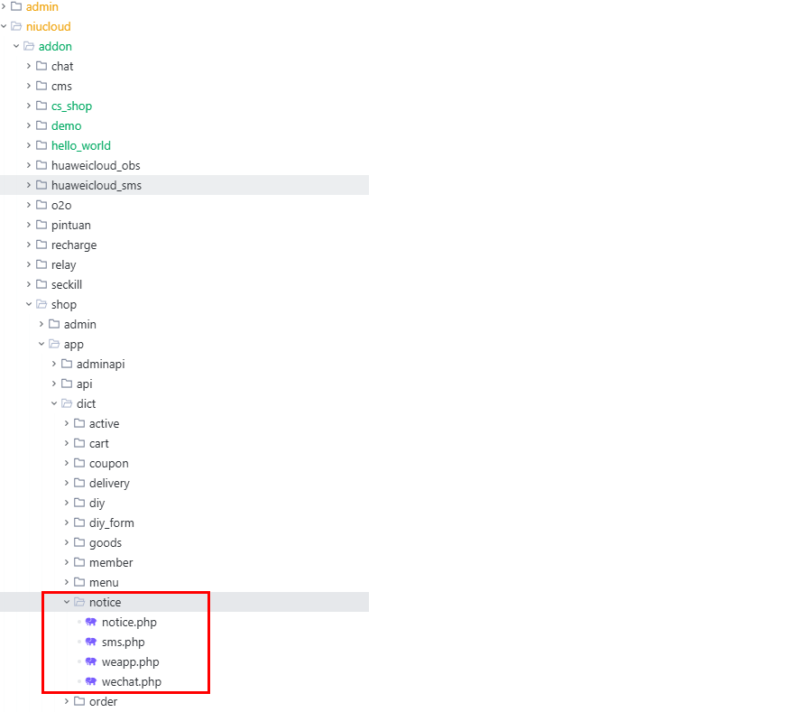 如果开发者开发一个插件,文件路径为:niucloud/addon/插件名称/app/dict/notice