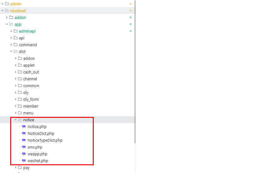 如果开发者直接是修改niucloud-admin框架,文件路径为:niucloud\app\dict\notice