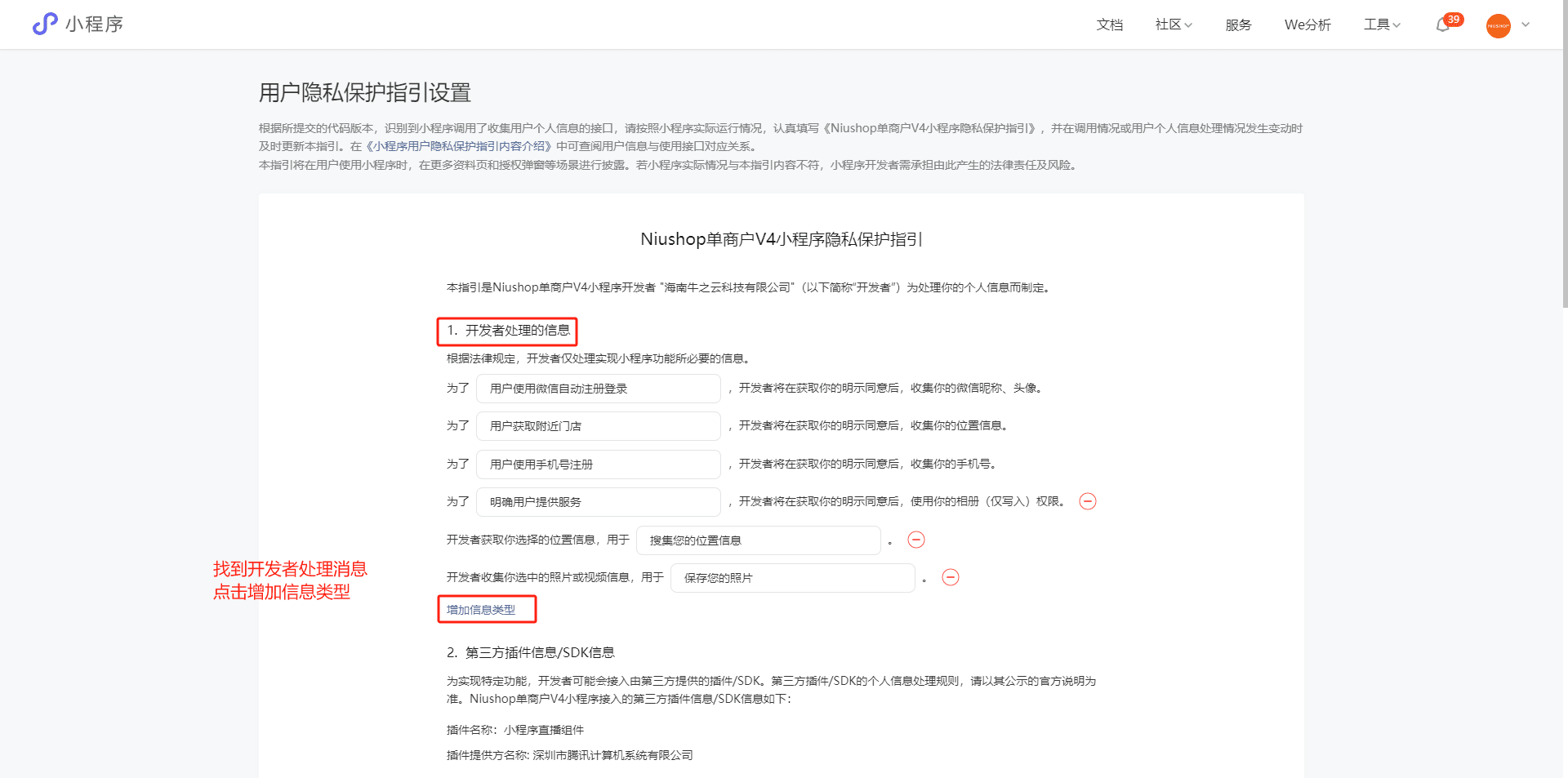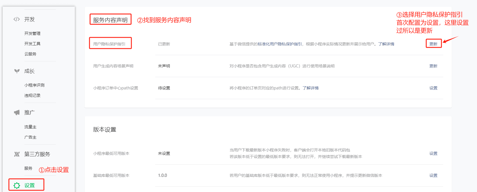 登录微信小程序平台,侧边栏点击设置,找到服务内容声明,选择用户隐私保护指引,点击设置/更新