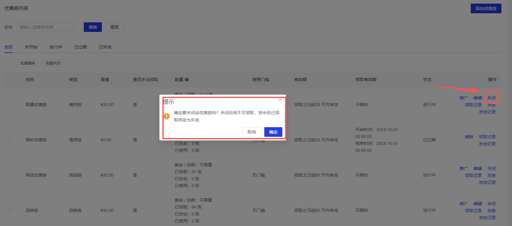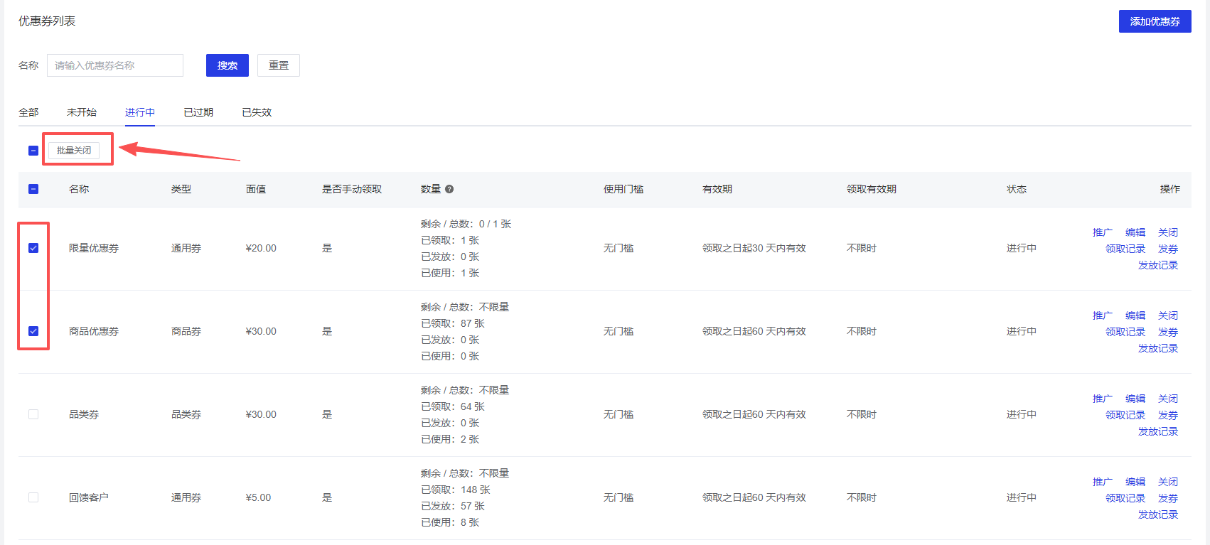 批量关闭:选中多个优惠券,点击【批量关闭】按钮,批量关闭选中的优惠券
