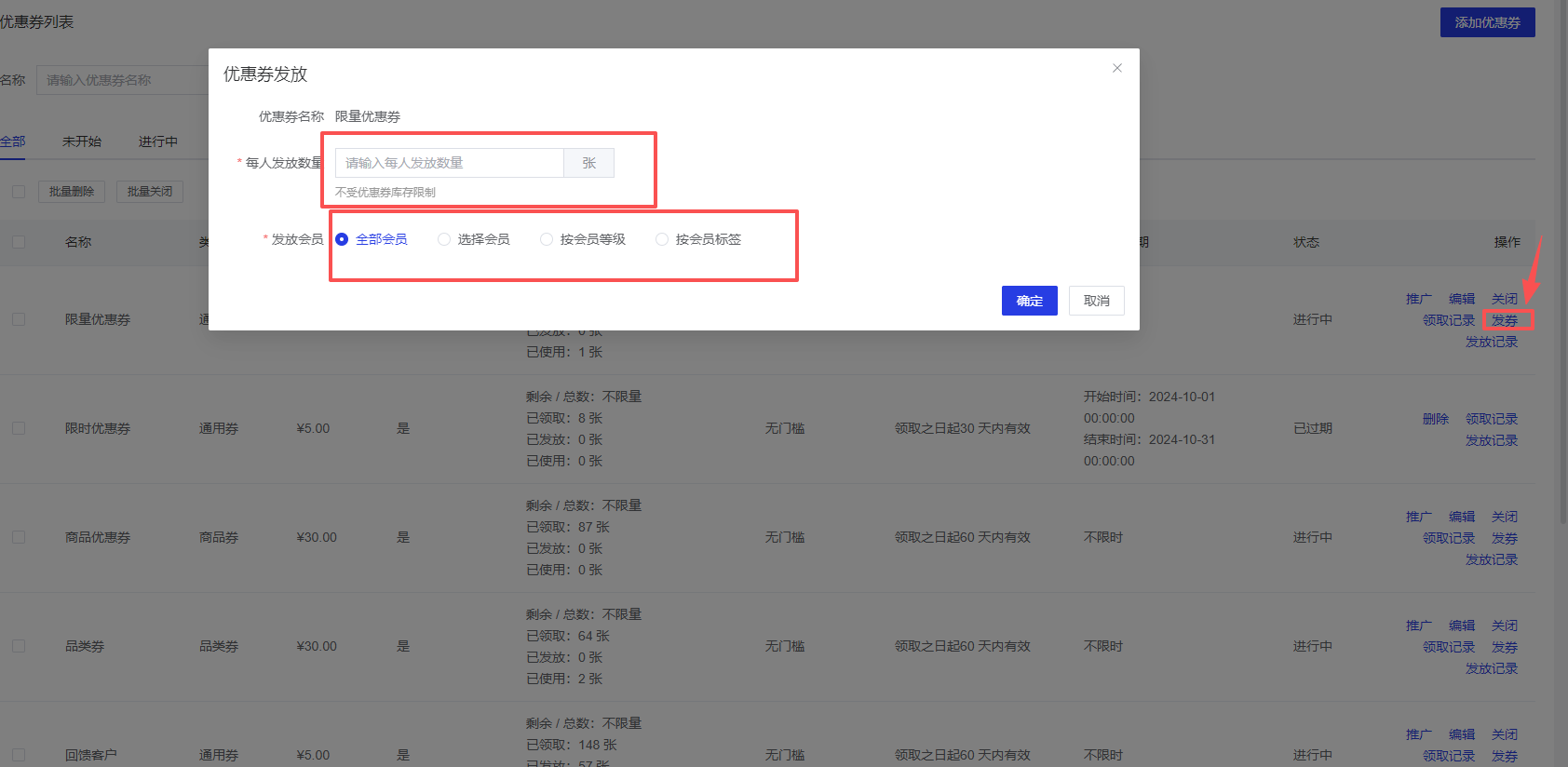 每人发放数量:设置每位符合条件的会员将获得的优惠券数量,必填项