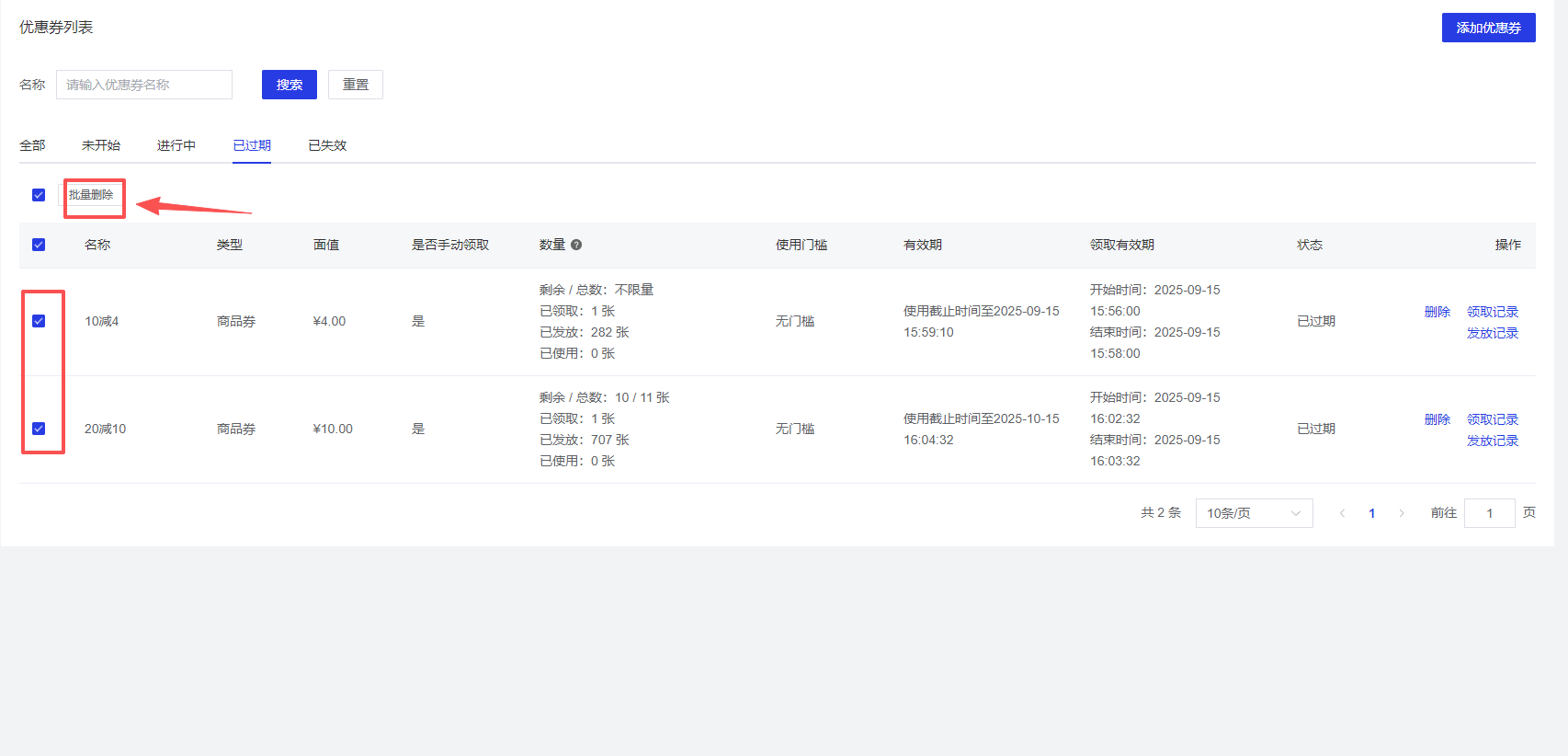 批量删除:选中多个优惠券,点击【批量删除】按钮,批量删除选中的优惠券