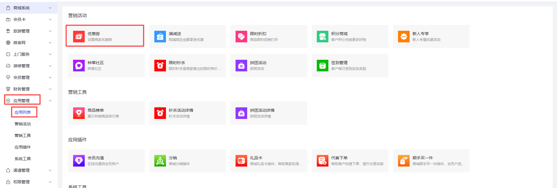 优惠券活动支持优惠券的创建与编辑,以及领取记录和发放记录的查询功能。优惠券是商城系统提供的一种重要营销工具,商家通过创建和发放优惠券,提升交易成交率。