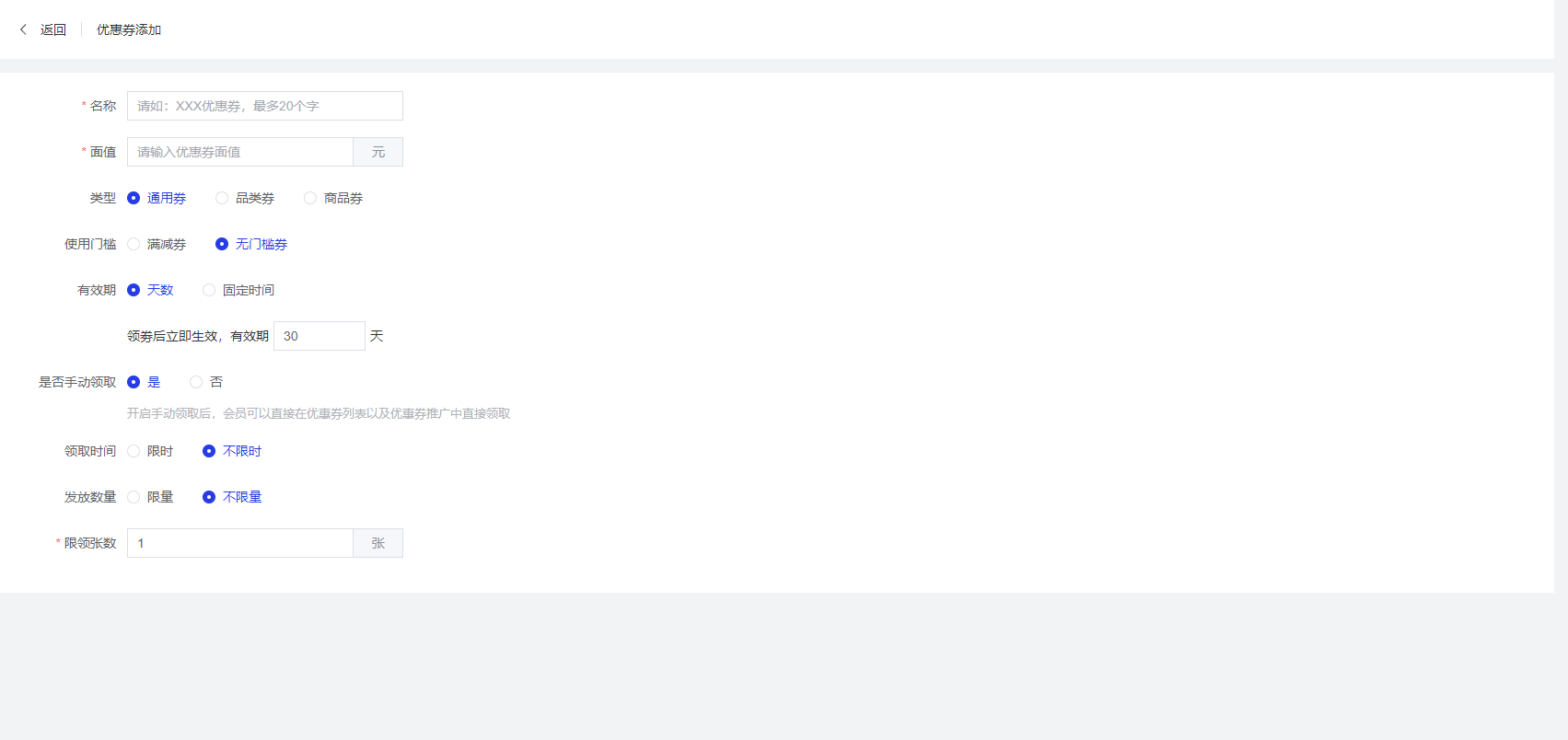点击【添加优惠券】按钮,页面跳转至优惠券添加页面。