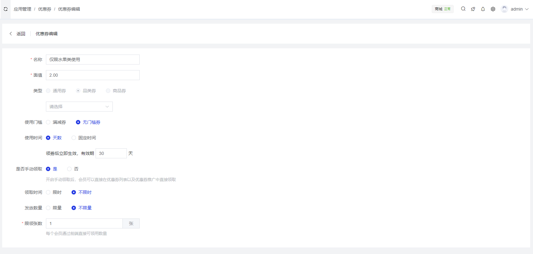 同【添加优惠券】,除了【优惠券类型】不可编辑,其余项均可编辑