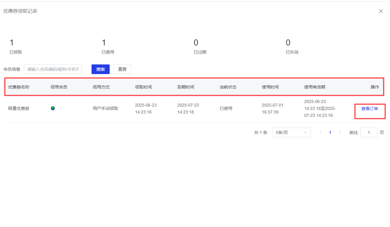 - 领取记录:查看优惠券的领取情况,包括优惠券名称、领用会员、领用方式、领取时间等信息