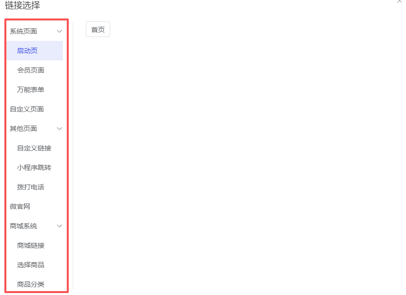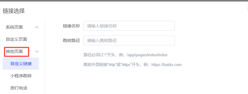 自定义链接: 路径必须以“/”开头,例:/app/pages/index/index 跳转外部链接“http”或“https”开头,例:https://baidu.com