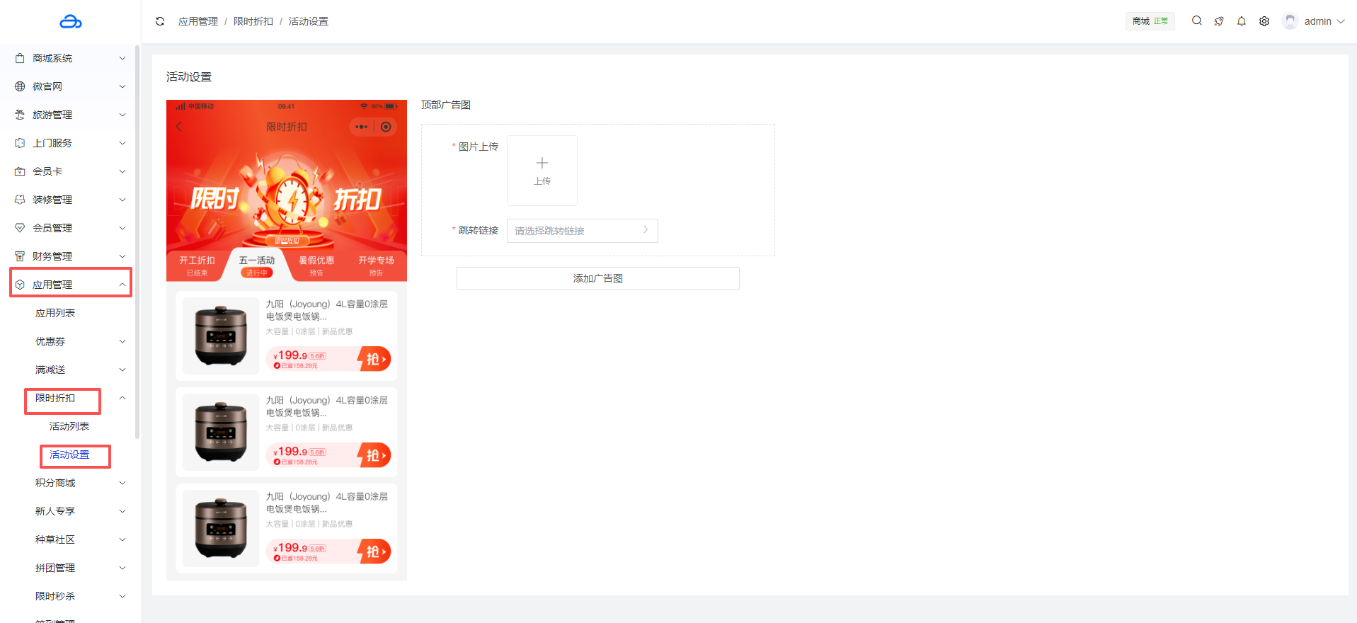 活动设置是限时折扣功能的核心配置模块,主要用于商家创建和管理具体的限时折扣活动内容。通过该模块,商家可以自定义设计活动的展示页面。
