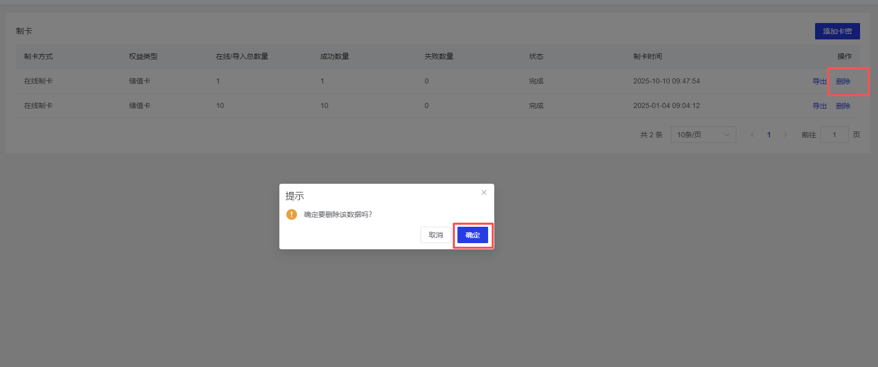 点击导出,确定并导出即可批量导出制卡数据,包含卡号、密钥、面值等信息