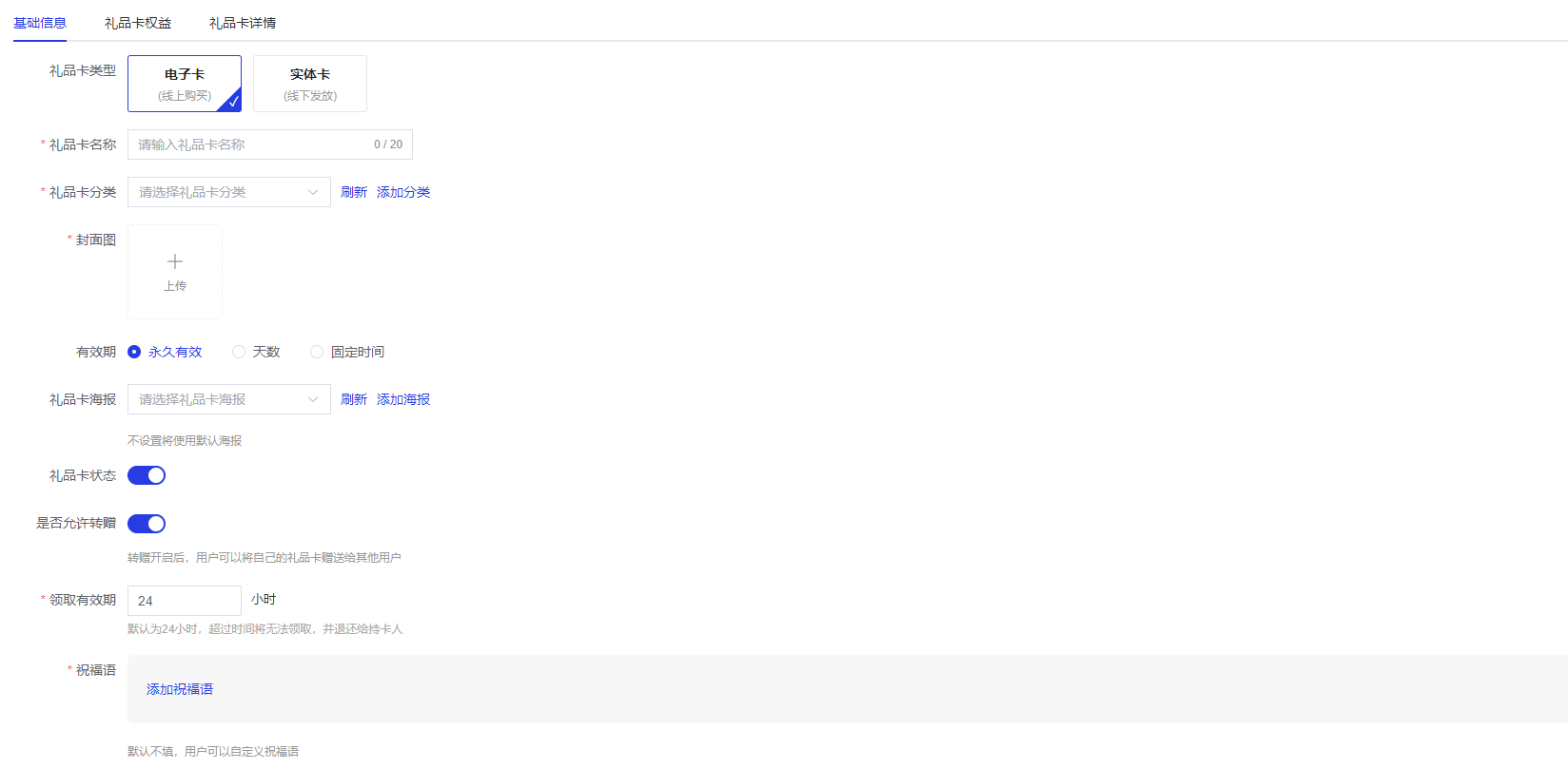 是否允许转赠:转赠开启后,用户可以将自己的礼品卡赠送给其他用户