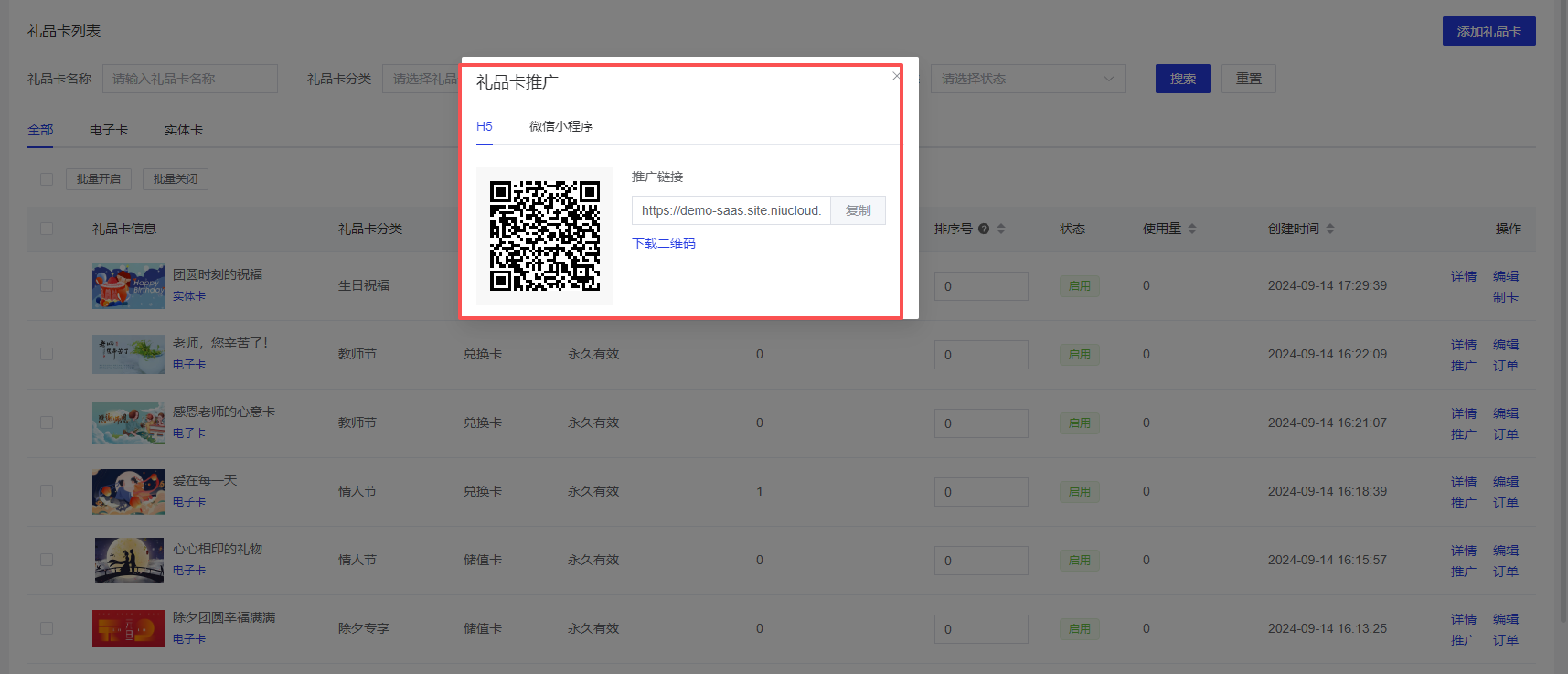 - 单次可生成单个礼品卡的推广素材,包含二维码、推广链接(可直接通过扫一扫二维码或复制链接查看礼品卡详情页展示)