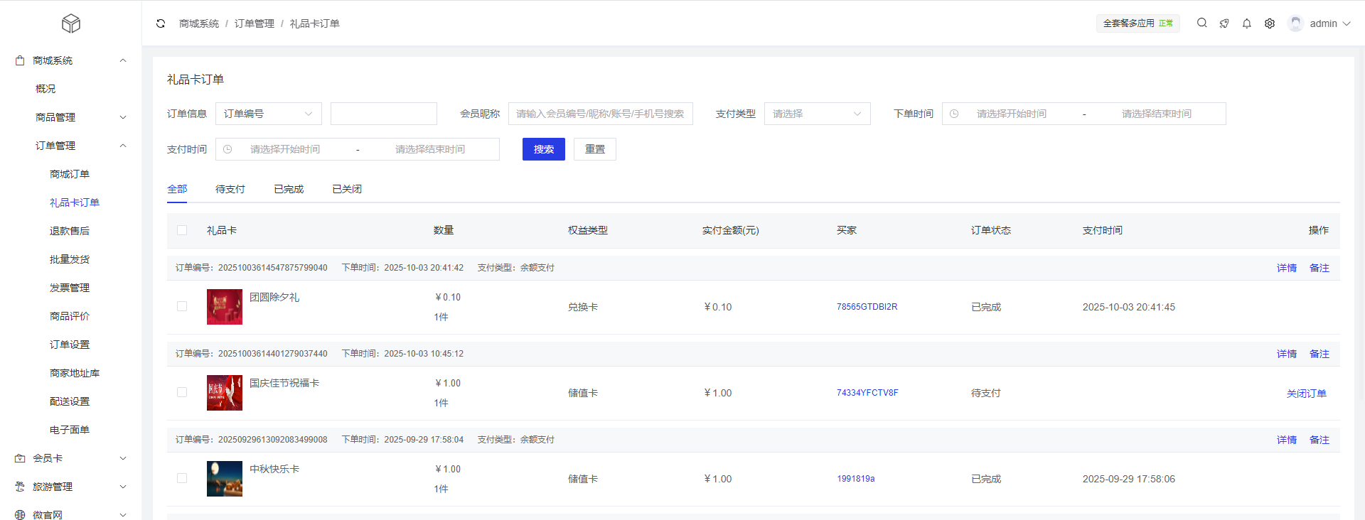 点击订单,页面跳转至商城系统/订单管理/礼品卡订单页面