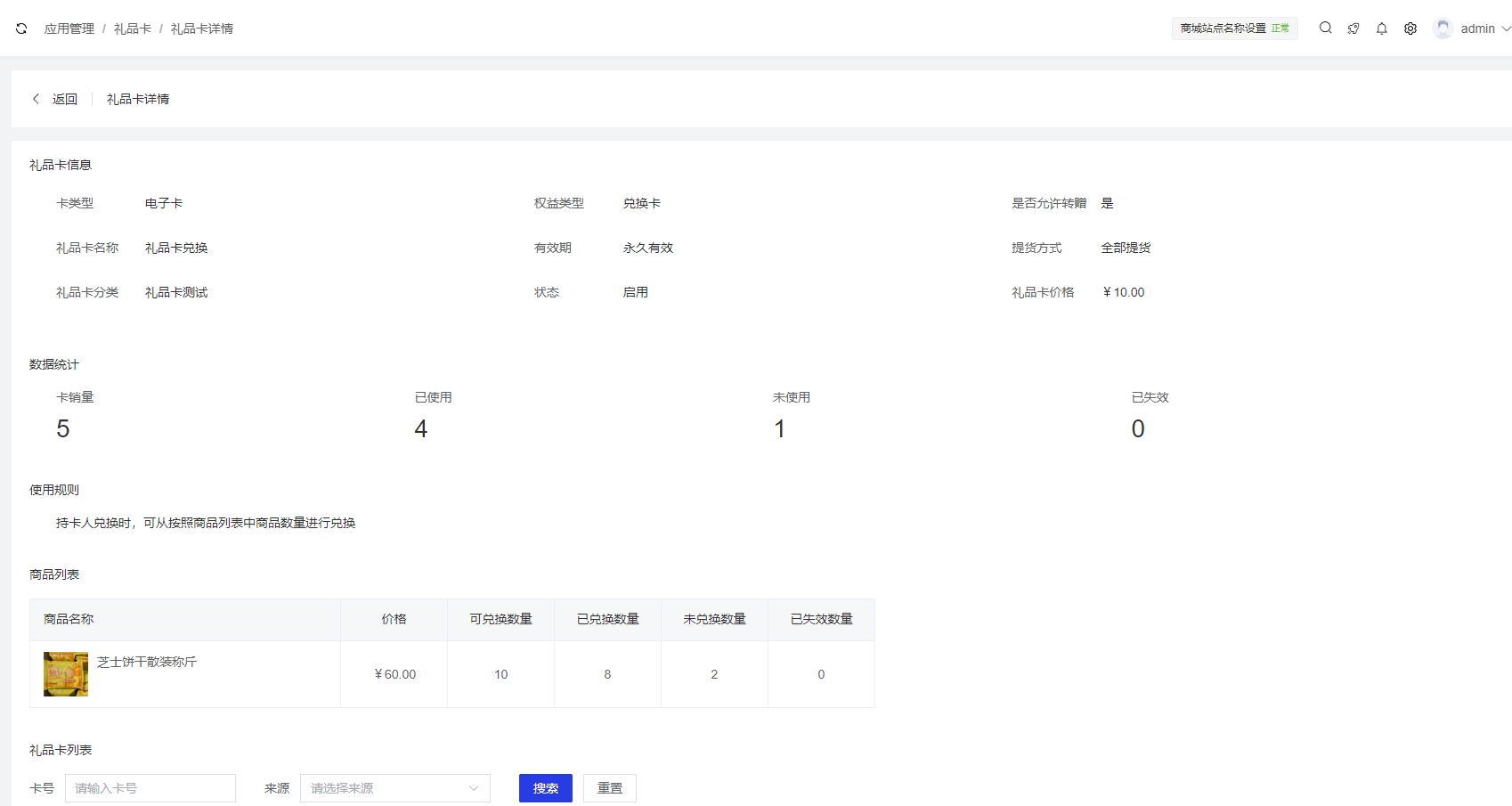 点击详情,即可查看礼品卡的详细信息,包括礼品卡信息、数据统计、商品列表、储值余额等信息