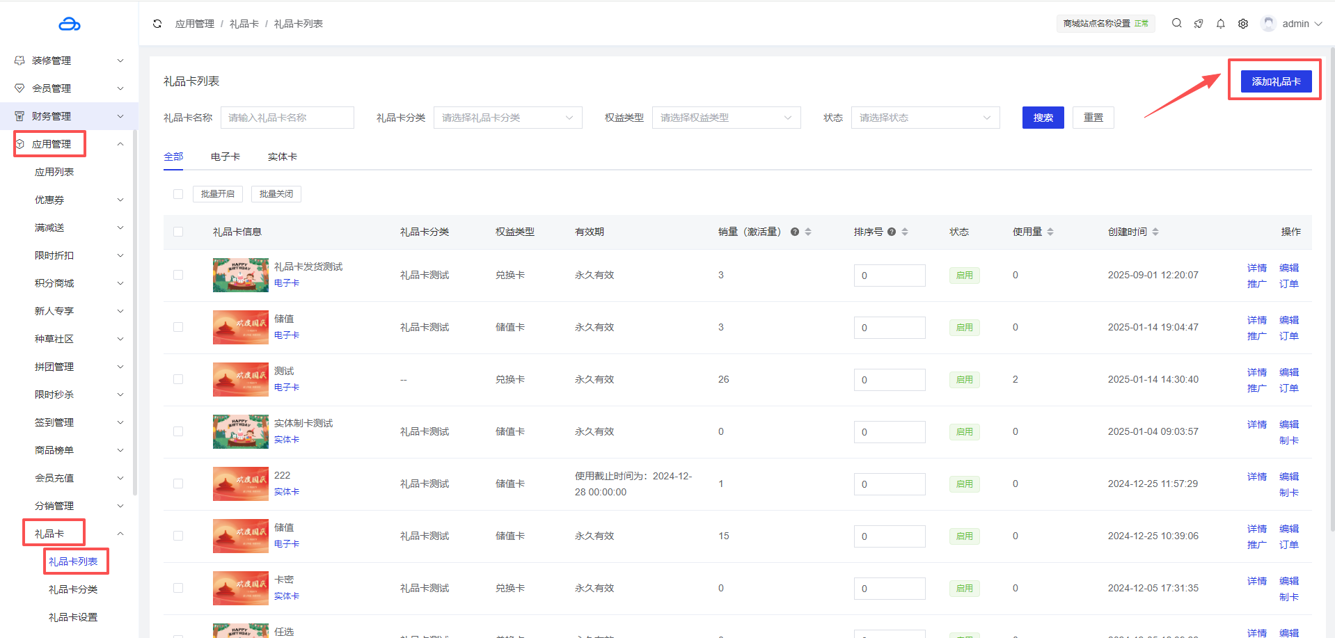 应用管理 >应用列表 > 礼品卡 > 礼品卡列表 > 添加礼品卡