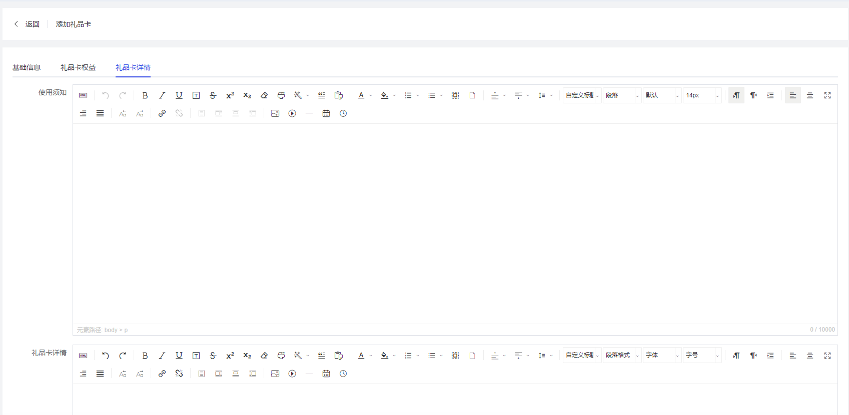 添加礼品卡功能允许商家创建和配置不同类型的礼品卡,作为商家营销和用户福利发放的重要工具。通过此功能,商家可以设置礼品卡的基础信息、权益规则和详细说明,满足不同场景下的营销需求,提升用户购买体验和品牌影响力。