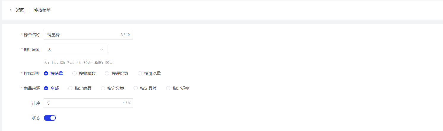 排序:输入排序列,用于确定榜单在前端展示的顺序(按照排序号从大到小排序)