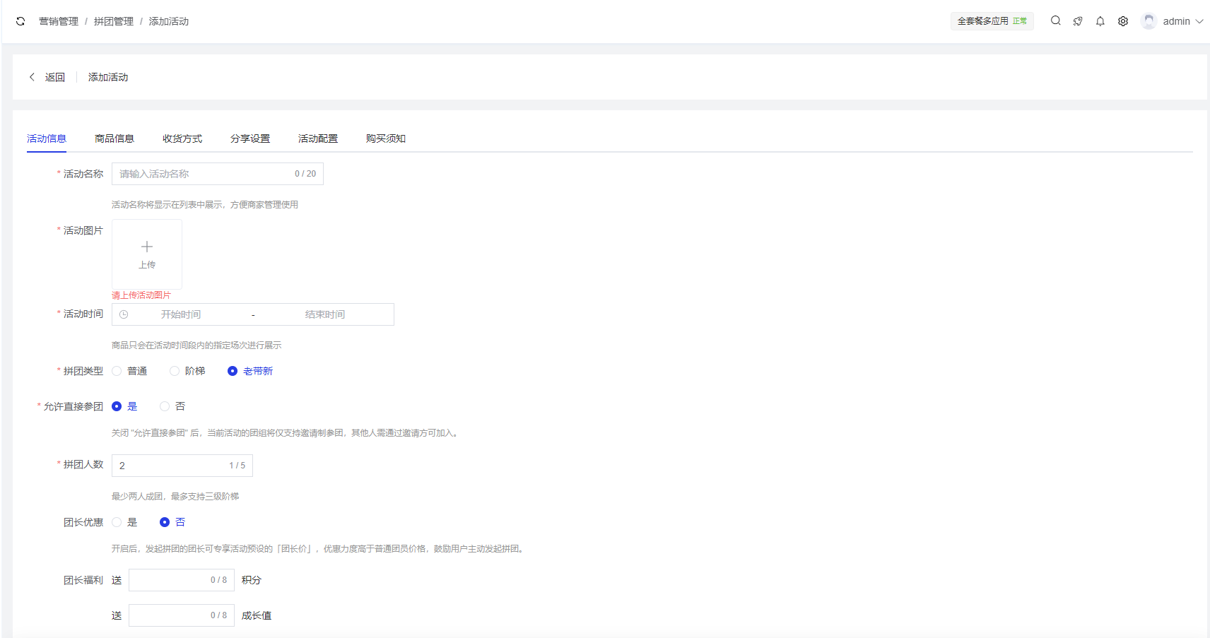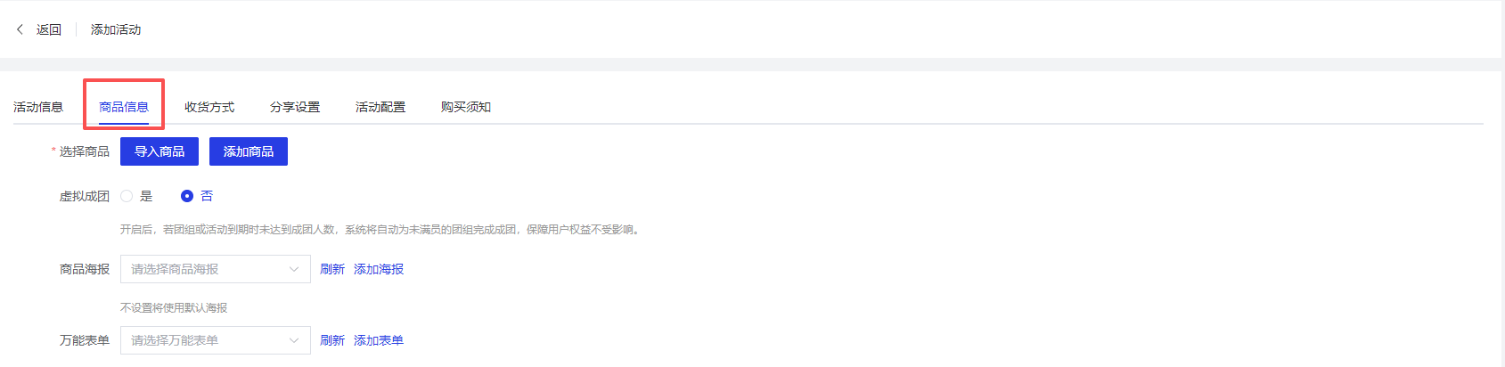 - 添加商品:直接在拼团活动中创建新的商品