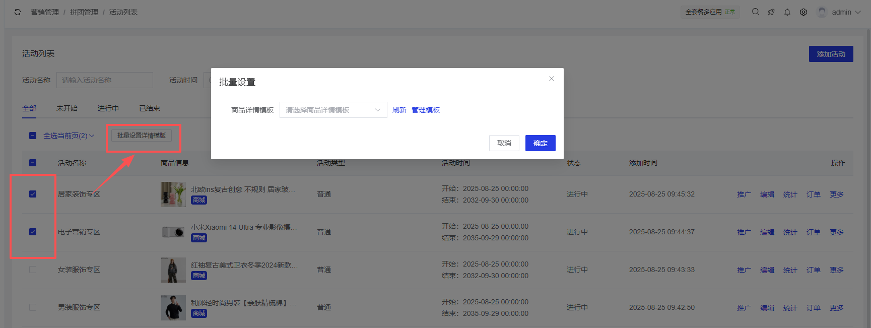 - 支持批量设置活动的详情模板