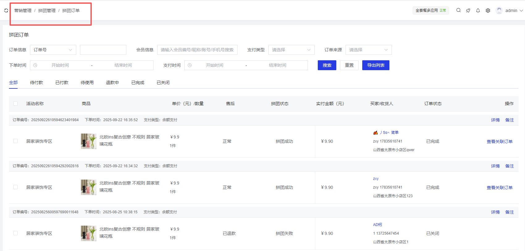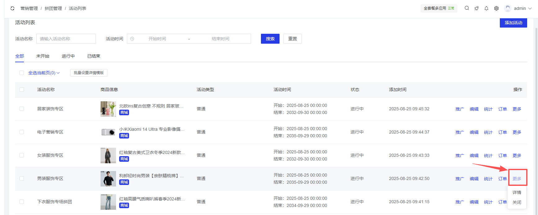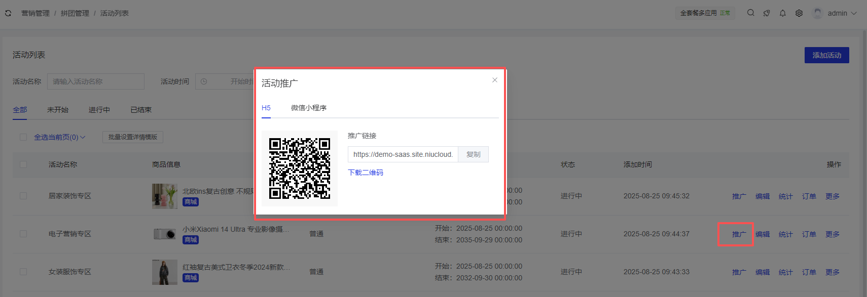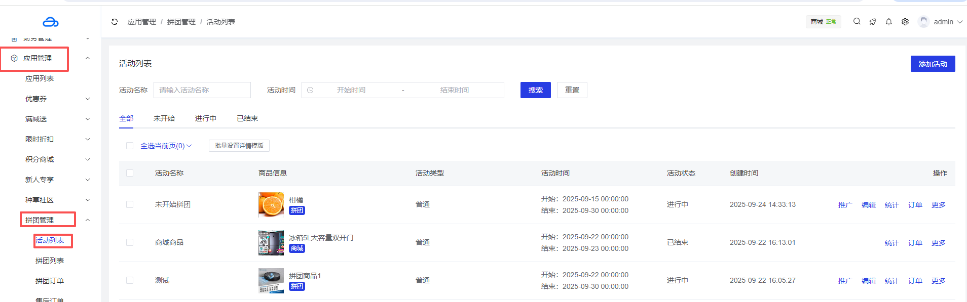 应用管理 > 应用列表 > 拼团管理 > 活动列表