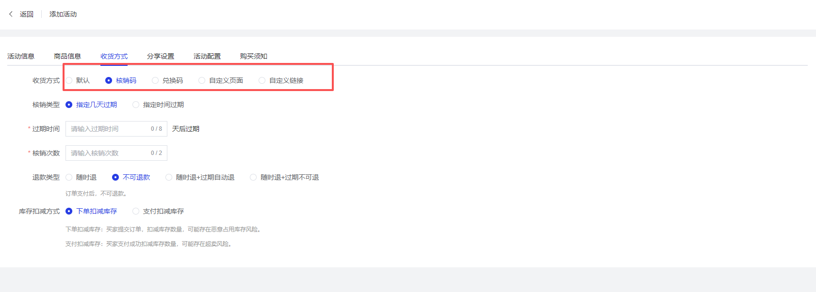 - 退款类型:支持随时退/不可退款/随时退+过期自动退/随时退+过期不可退