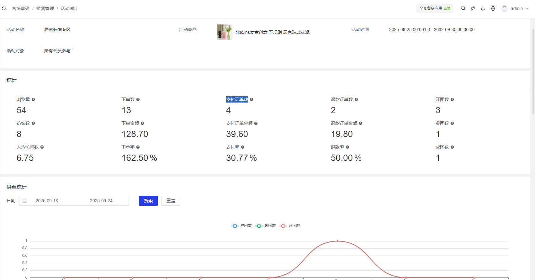 活动列表用于展示所有拼团活动的基本信息,并提供活动的创建、编辑、统计等功能。商家可以通过此页面全面了解拼团活动的整体状态,快速定位需要管理的活动,并进行相应的操作。