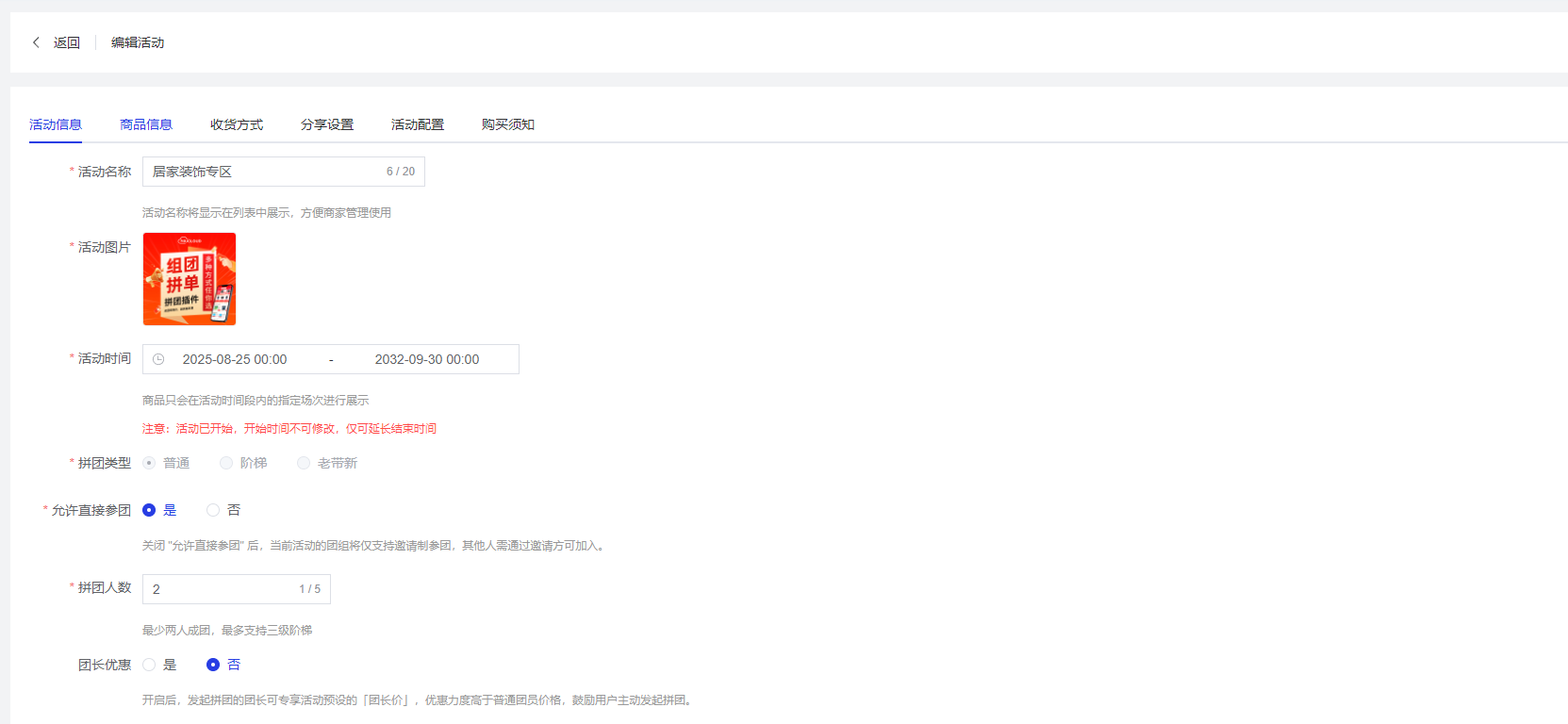 - 活动开始时间不可修改,仅可延长结束时间