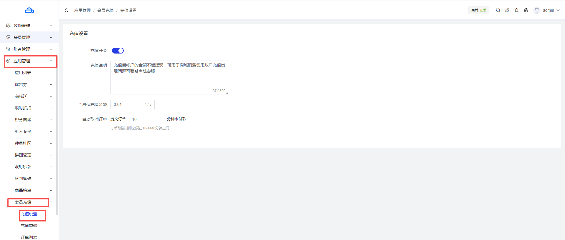 应用管理 > 应用列表 > 会员充值 > 充值设置