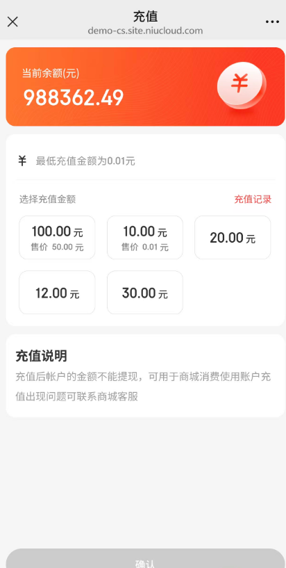 - 默认说明:"充值后账户的金额不能提现,可用于商城消费使用账户充值出现问题可联系商城客服"