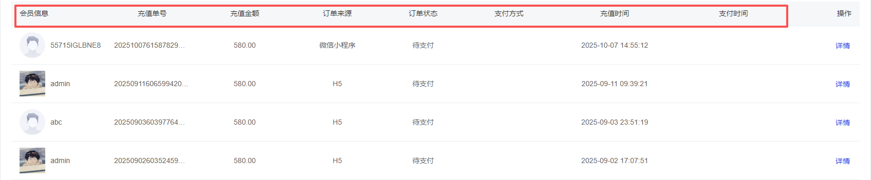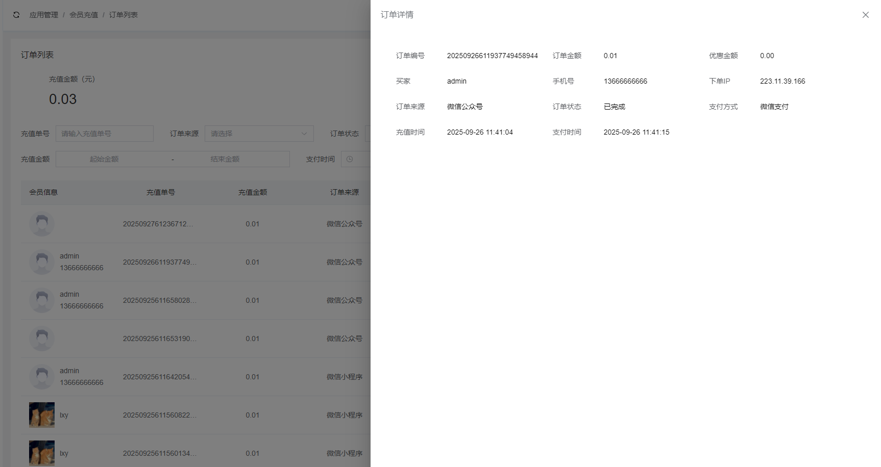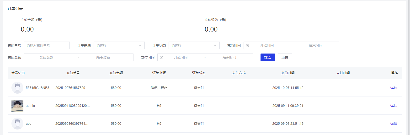 订单列表页面显示所有已创建的订单信息,包括会员信息、充值单号、充值金额等信息。