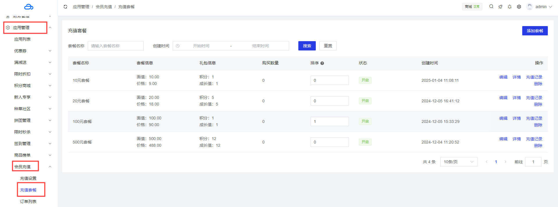 充值套餐页面显示所有已创建的充值套餐信息,包括套餐名称、套餐信息(面值、价格)、礼包信息(积分、成长值、优惠券)、购买数量、排序、状态和创建时间等。