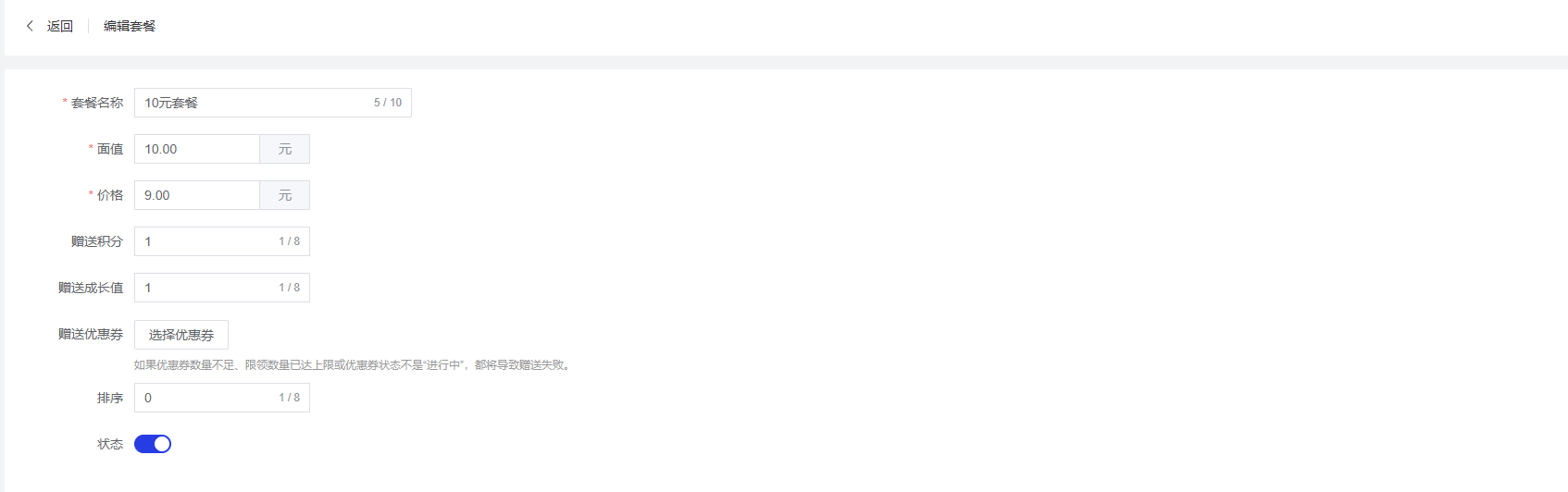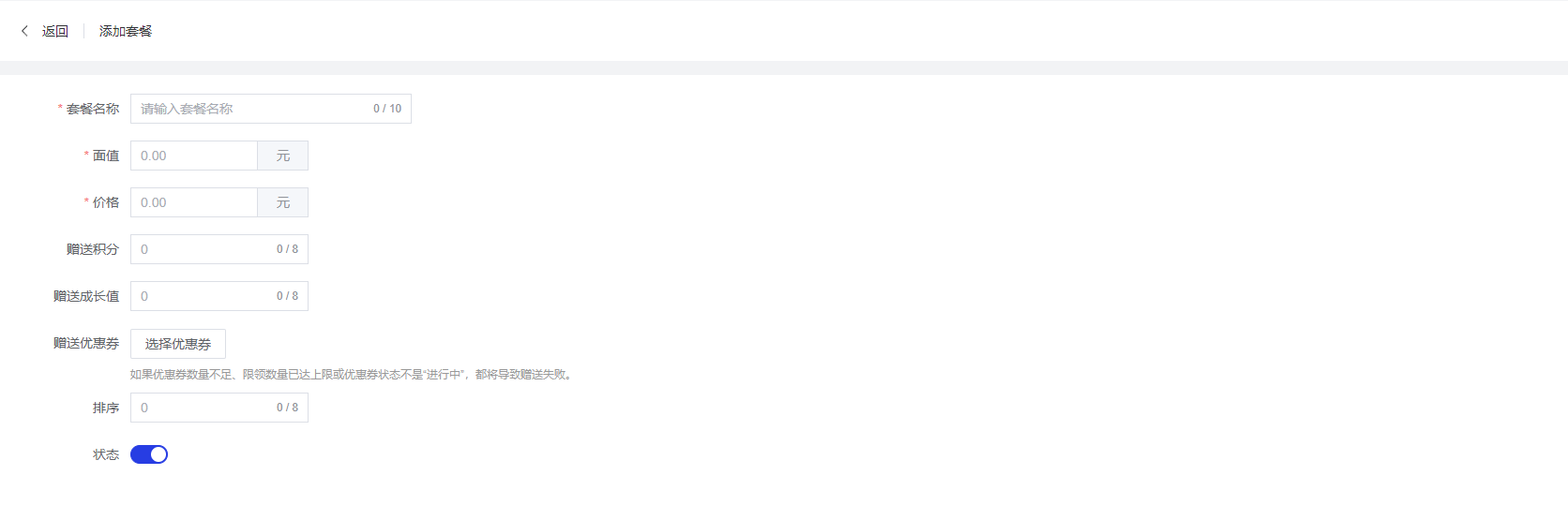 - 赠送成长值:选填项,最大输入8位数字,设置购买此套餐时额外赠送的成长值数量