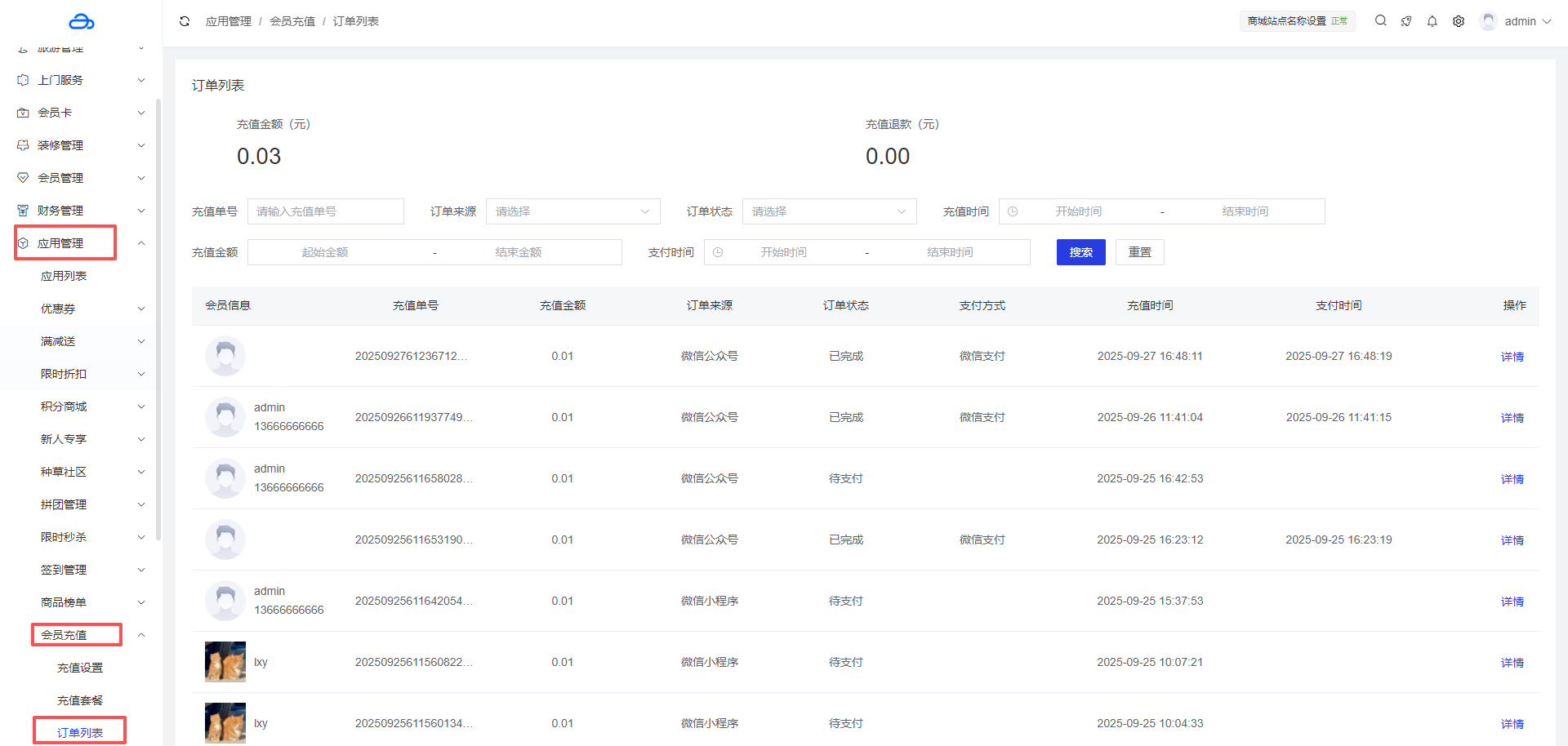 应用管理 > 应用列表 > 会员充值 > 订单列表