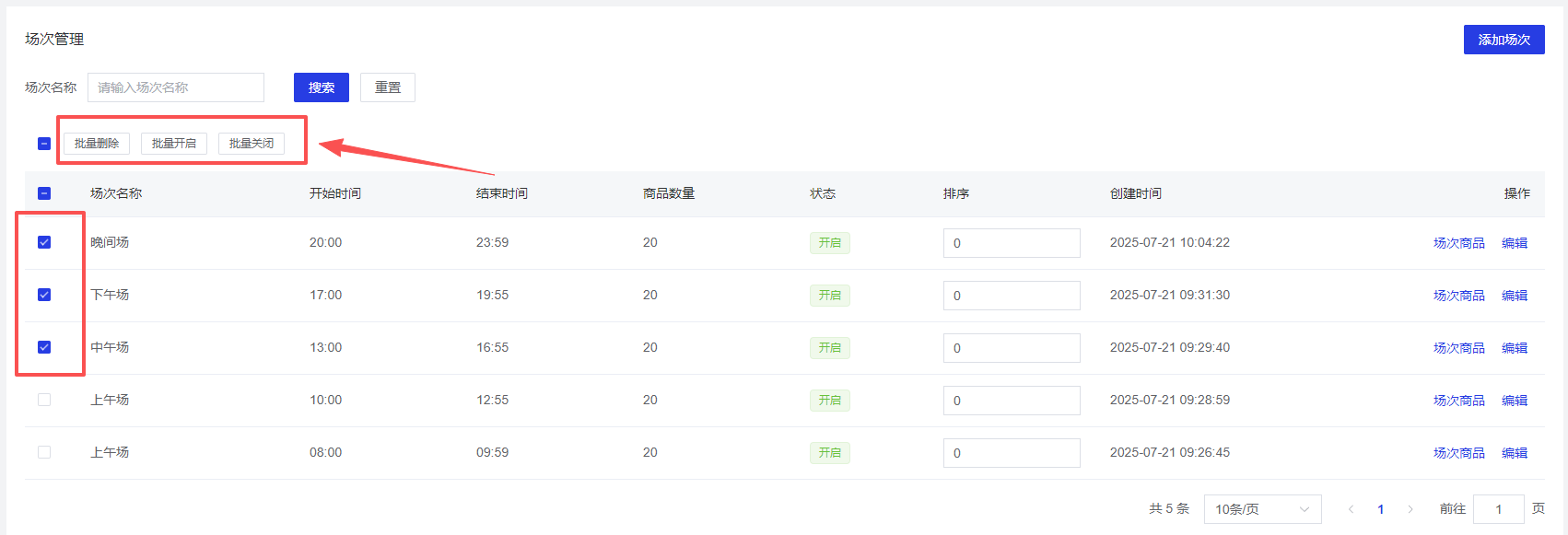 - 支持批量删除/批量开启/批量关闭场次