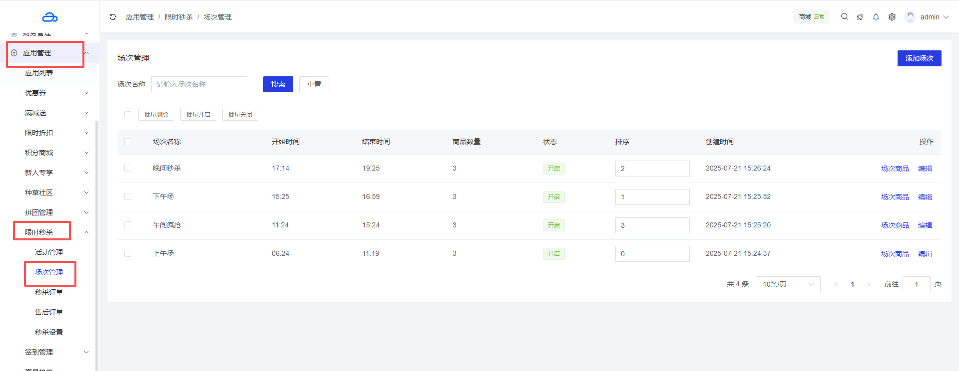 应用管理 > 应用列表 > 限时秒杀 > 场次管理
