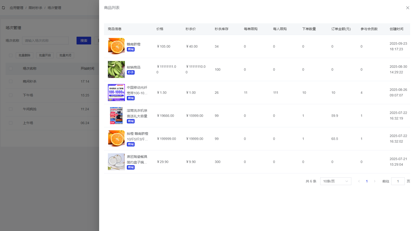 点击【场次商品】,即可查看当前场次参与的秒杀商品详情,包括商品名称、价格、秒杀价等信息。