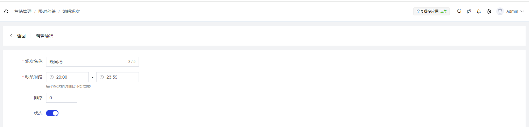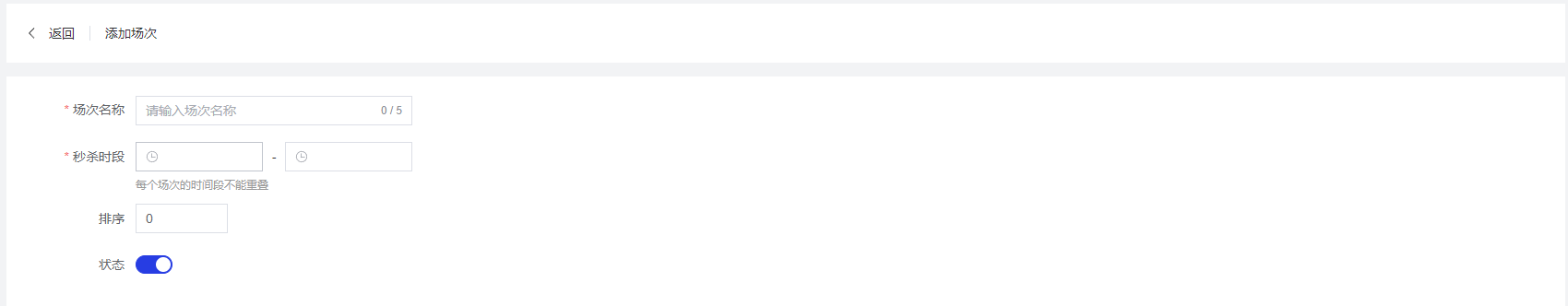 场次名称:必填项,最多5个字符,用于标识不同的秒杀时间段
