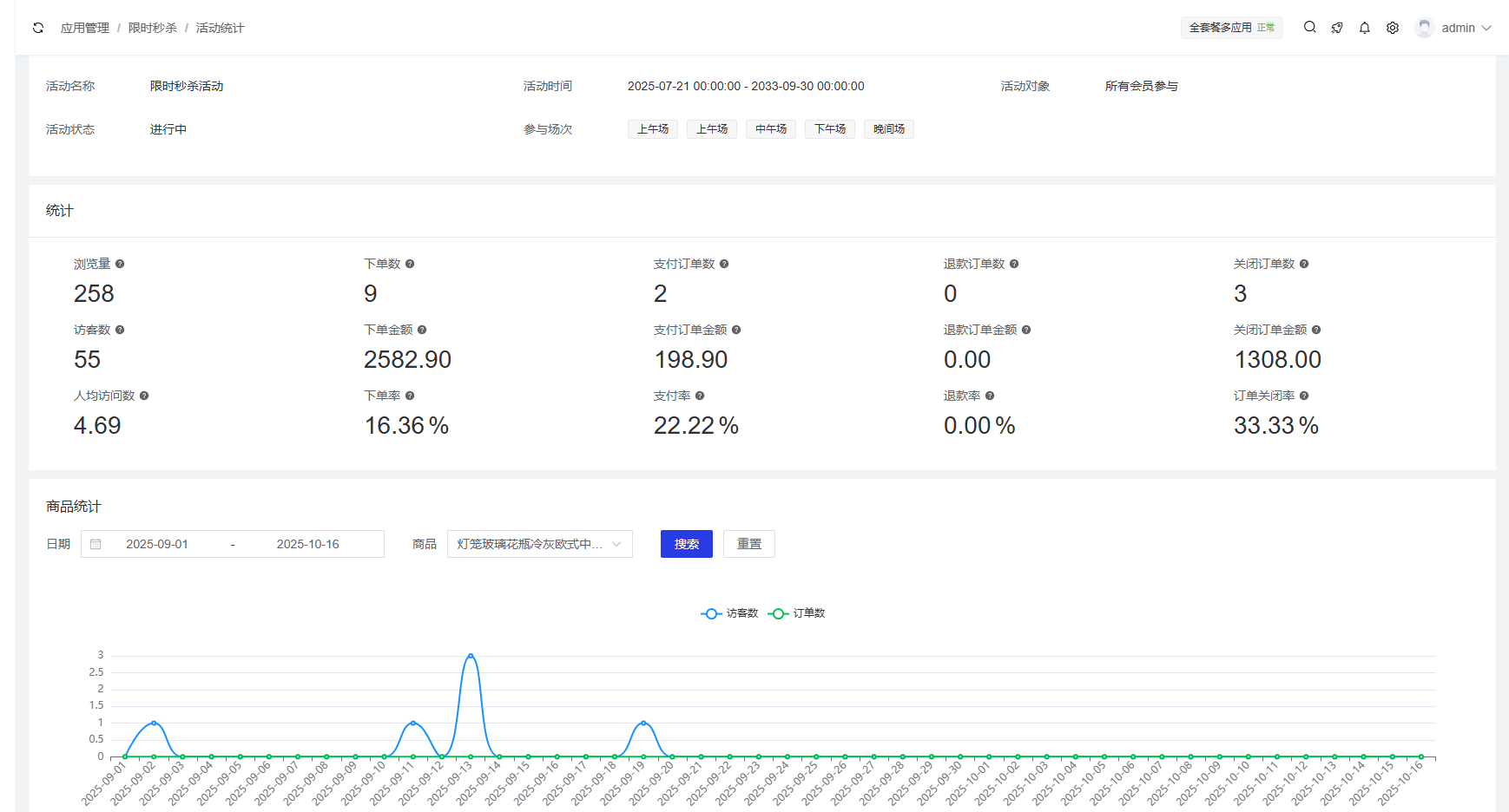 - 支持通过筛选时间范围查看活动在不同时间点的商品统计/订单统计/访客分析 /渠道数据统计数据
