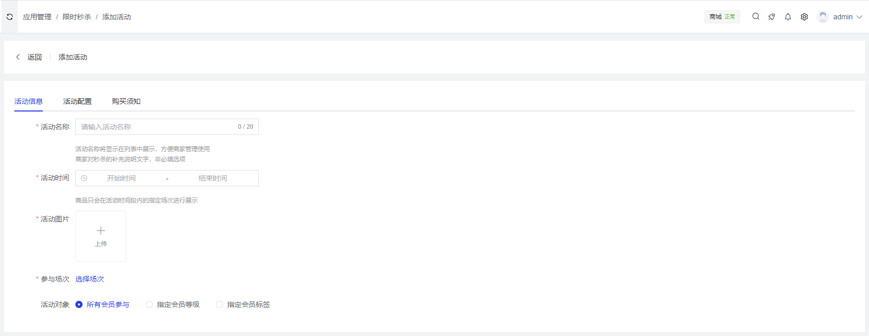 - 活动名称:必填项,不超过20个字符,活动名称将显示在列表中展示,方便商家管理使用