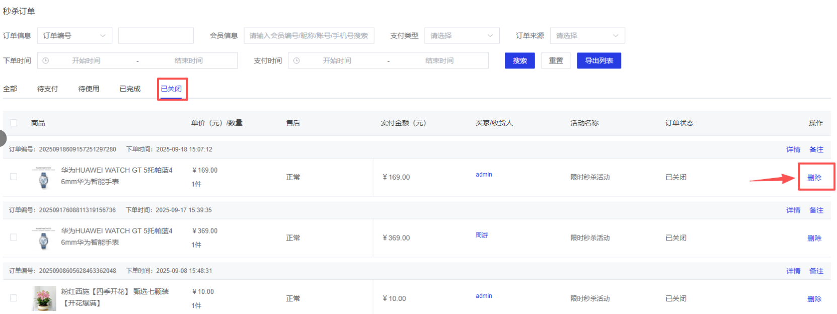 在已关闭订单列表,点击【删除订单】,删除订单后,订单将从列表中移除。