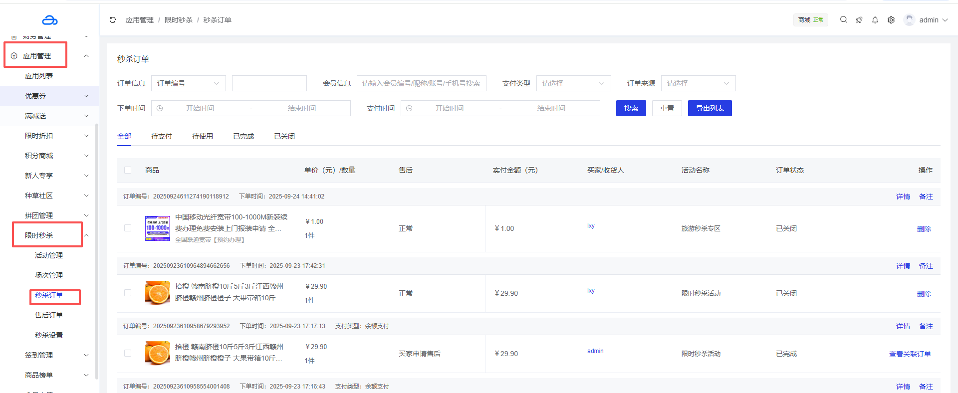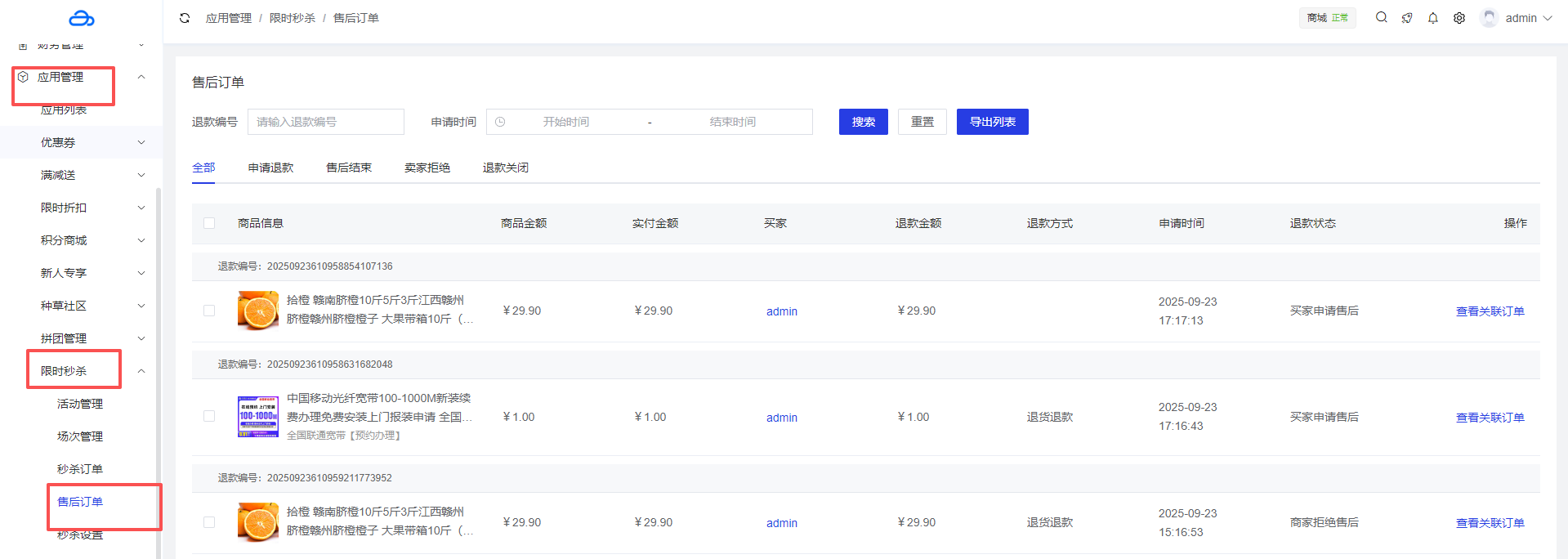 应用管理 > 应用列表 > 限时秒杀 > 售后订单