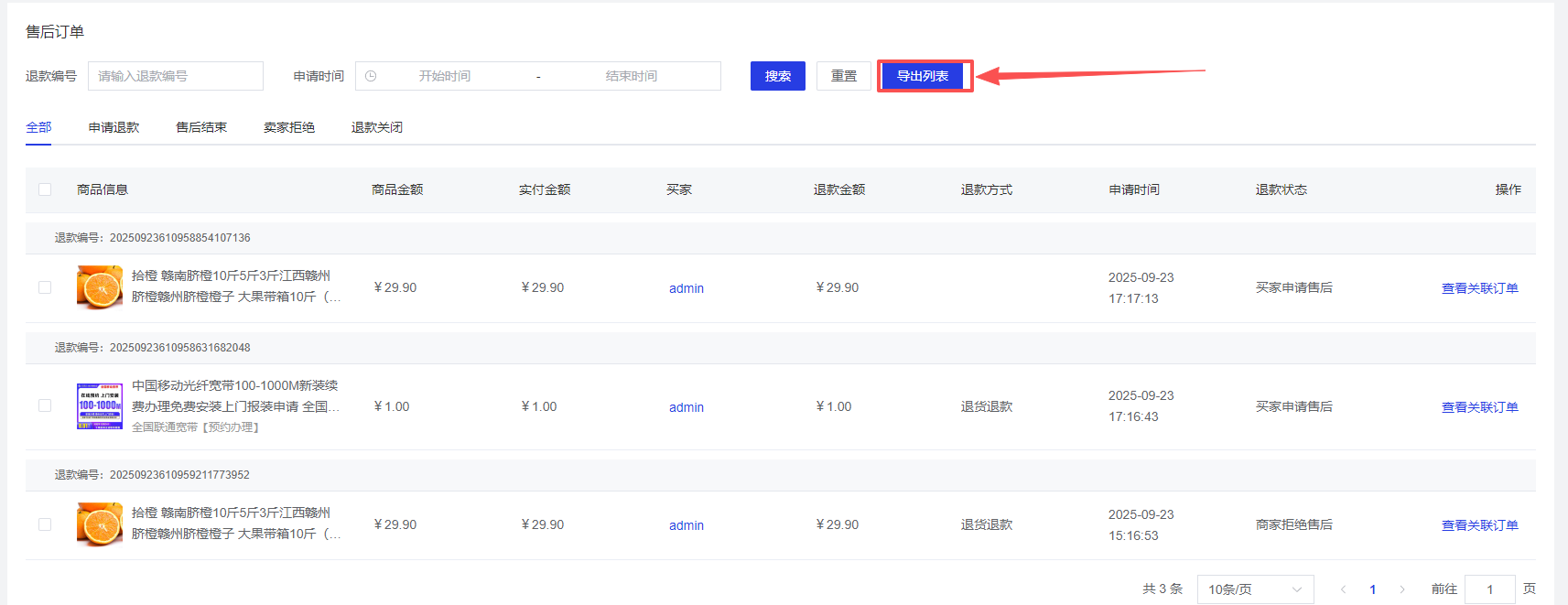 支持根据条件筛选售后订单数据,点击【导出列表】,可以将筛选数据导出为Excel文件,方便进行售后订单数据的分析和处理。