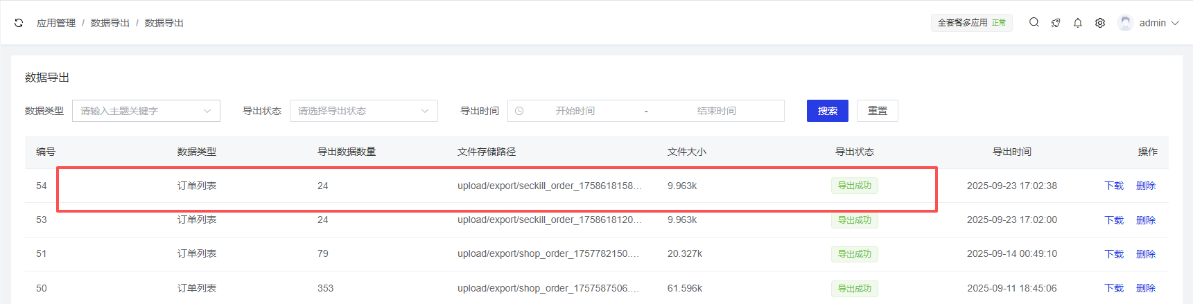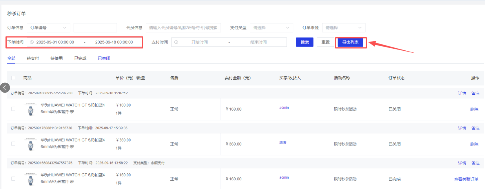支持根据条件筛选订单数据,点击【导出列表】,可以将筛选数据导出为Excel文件,方便进行订单数据的分析和处理。