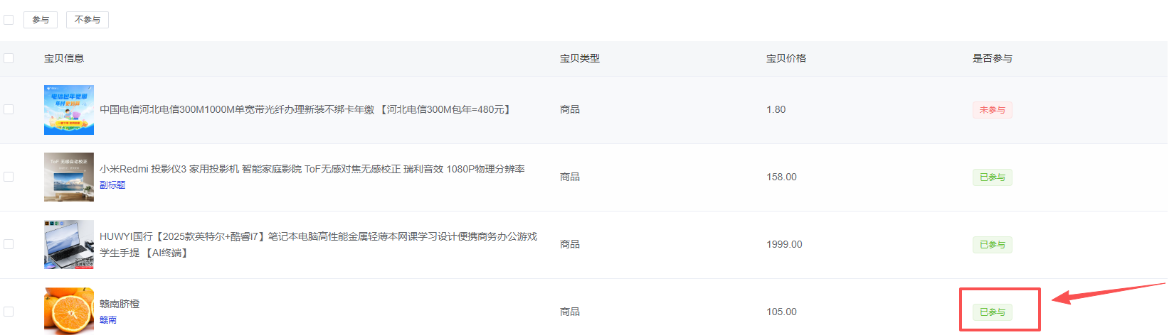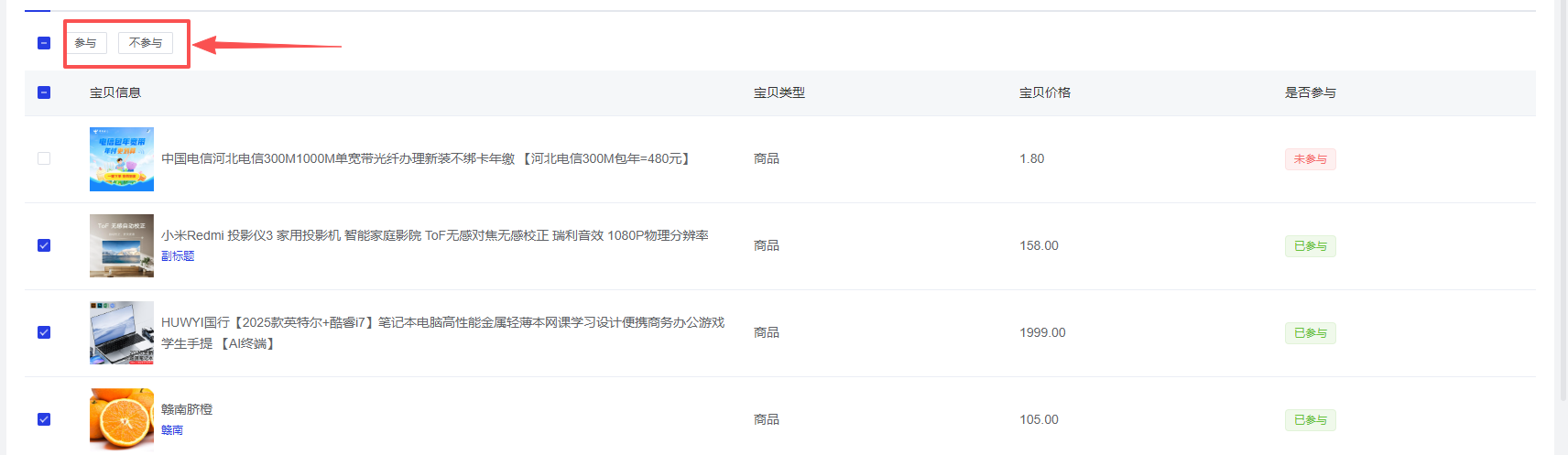 支持批量切换宝贝的参与状态,包括已参与和未参与。
