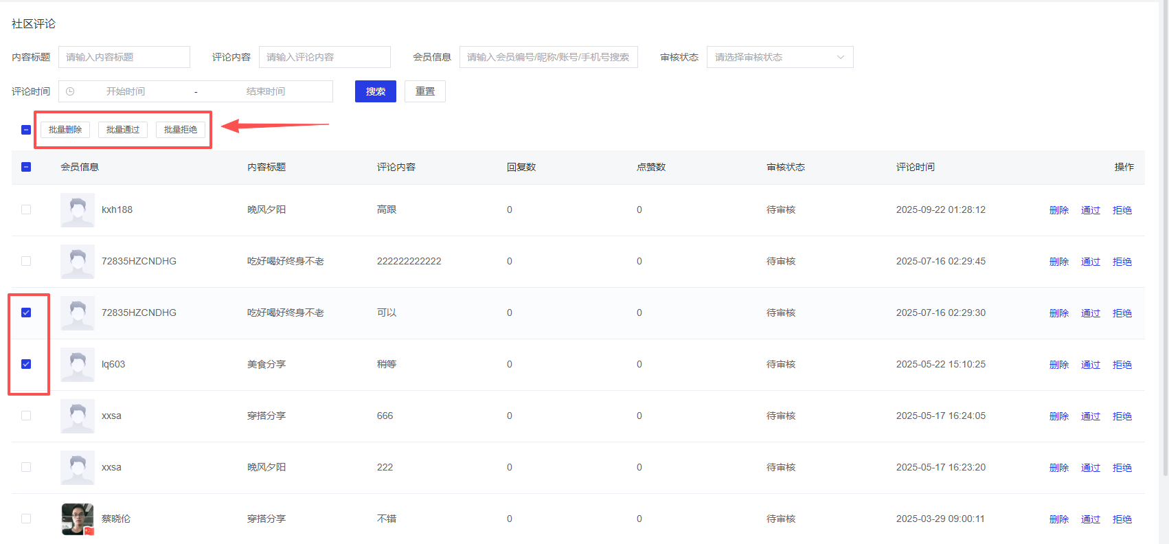 支持对待审核的评论进行批量操作,包括批量删除、批量通过、批量拒绝等。