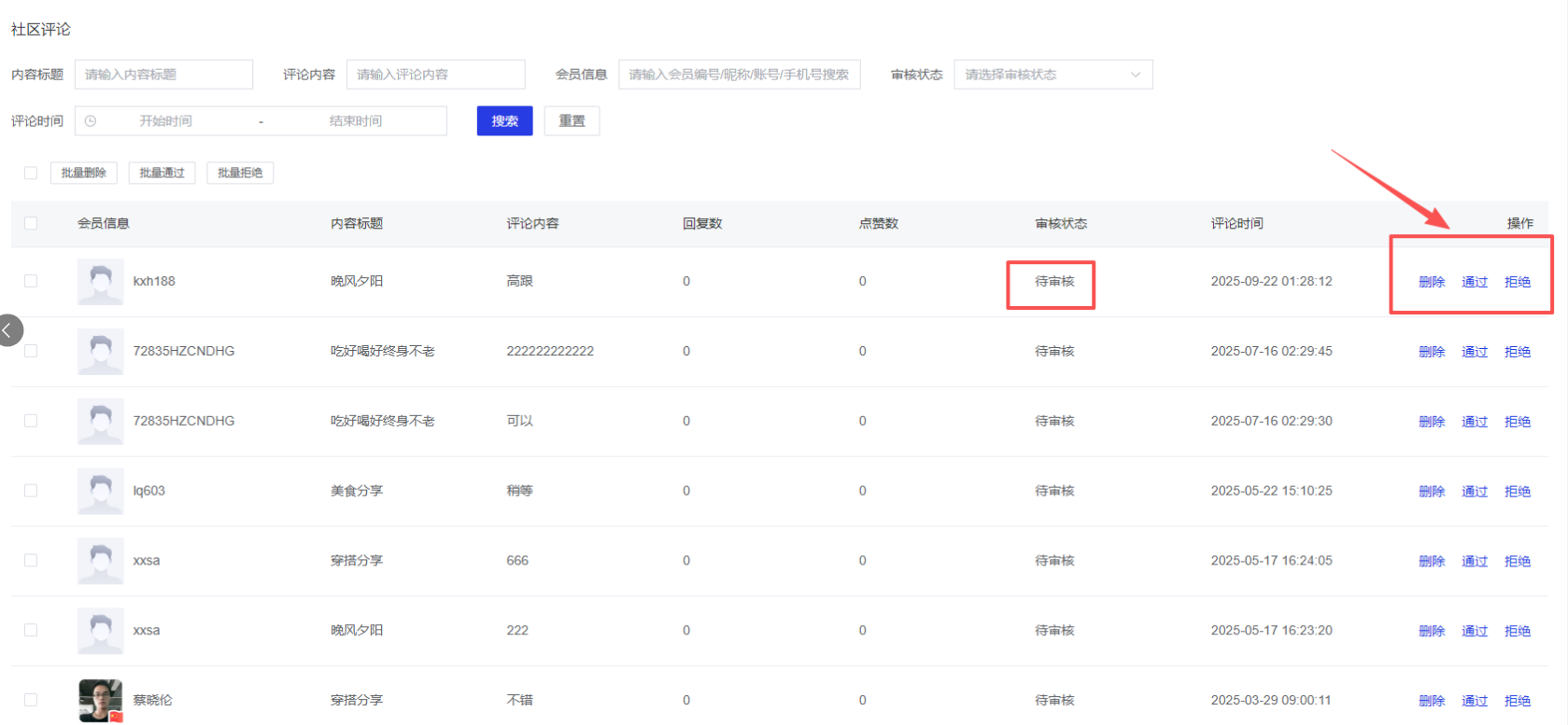 支持对待审核的评论进行通过、拒绝、删除等操作。