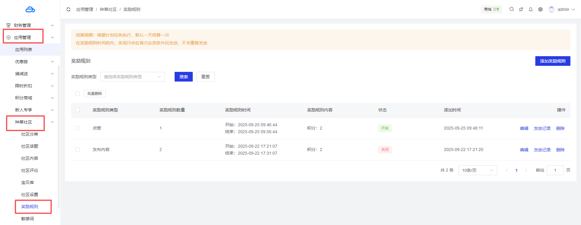 应用管理 > 应用列表 > 种草社区 > 奖励规则