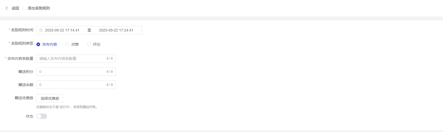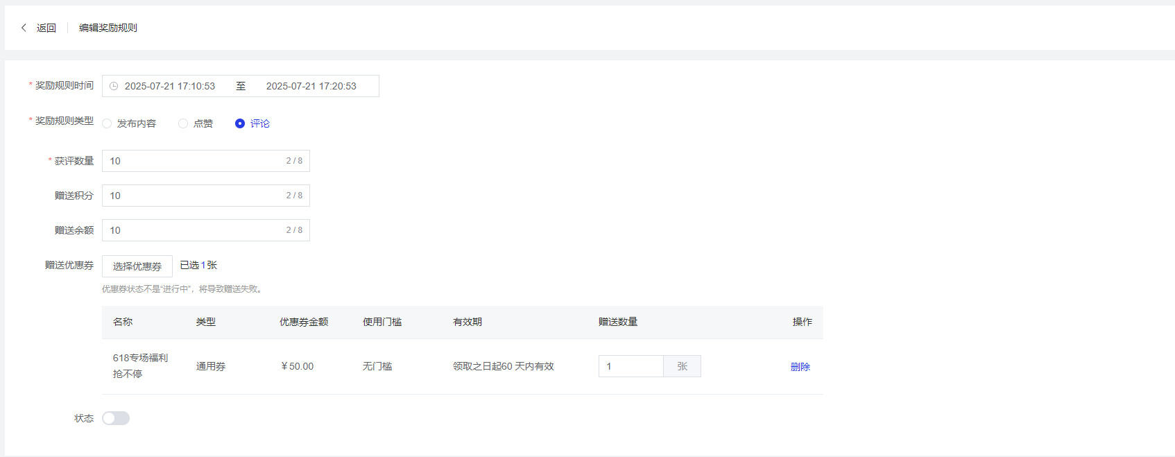 提供状态开关,控制奖励规则的启用状态
