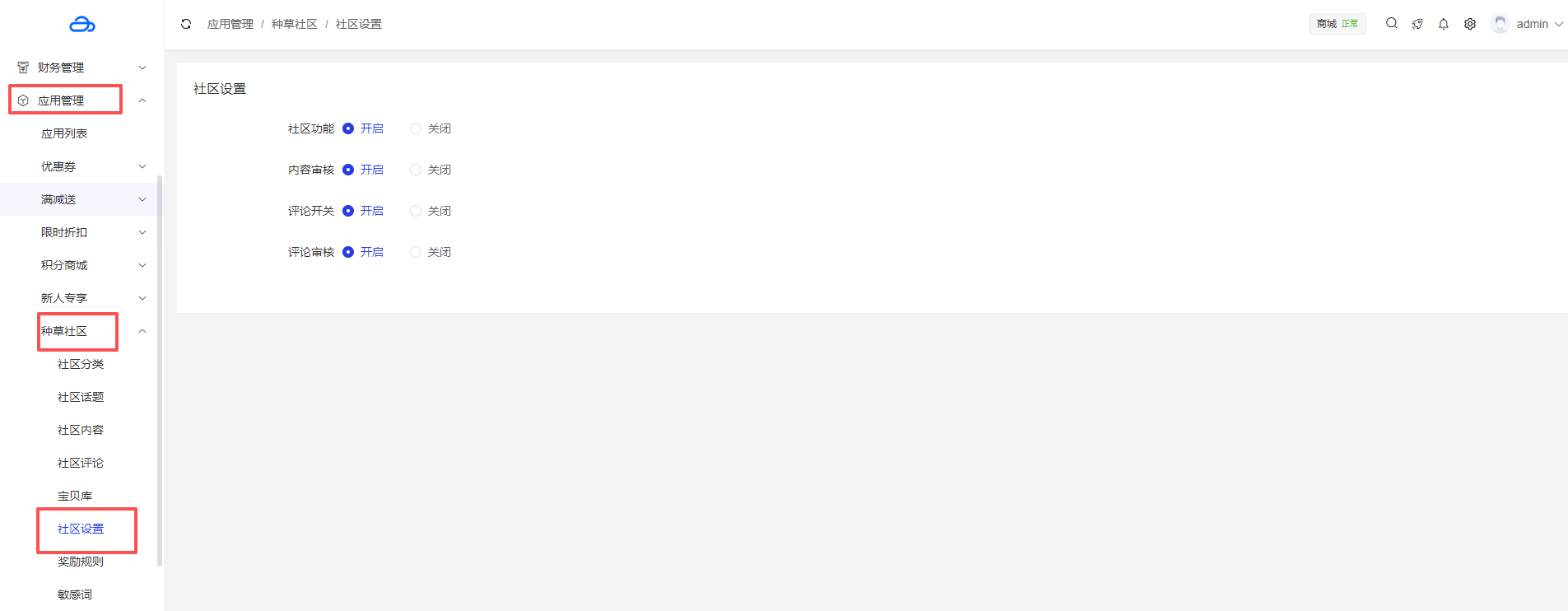 应用管理 > 应用列表 > 种草社区 > 社区设置