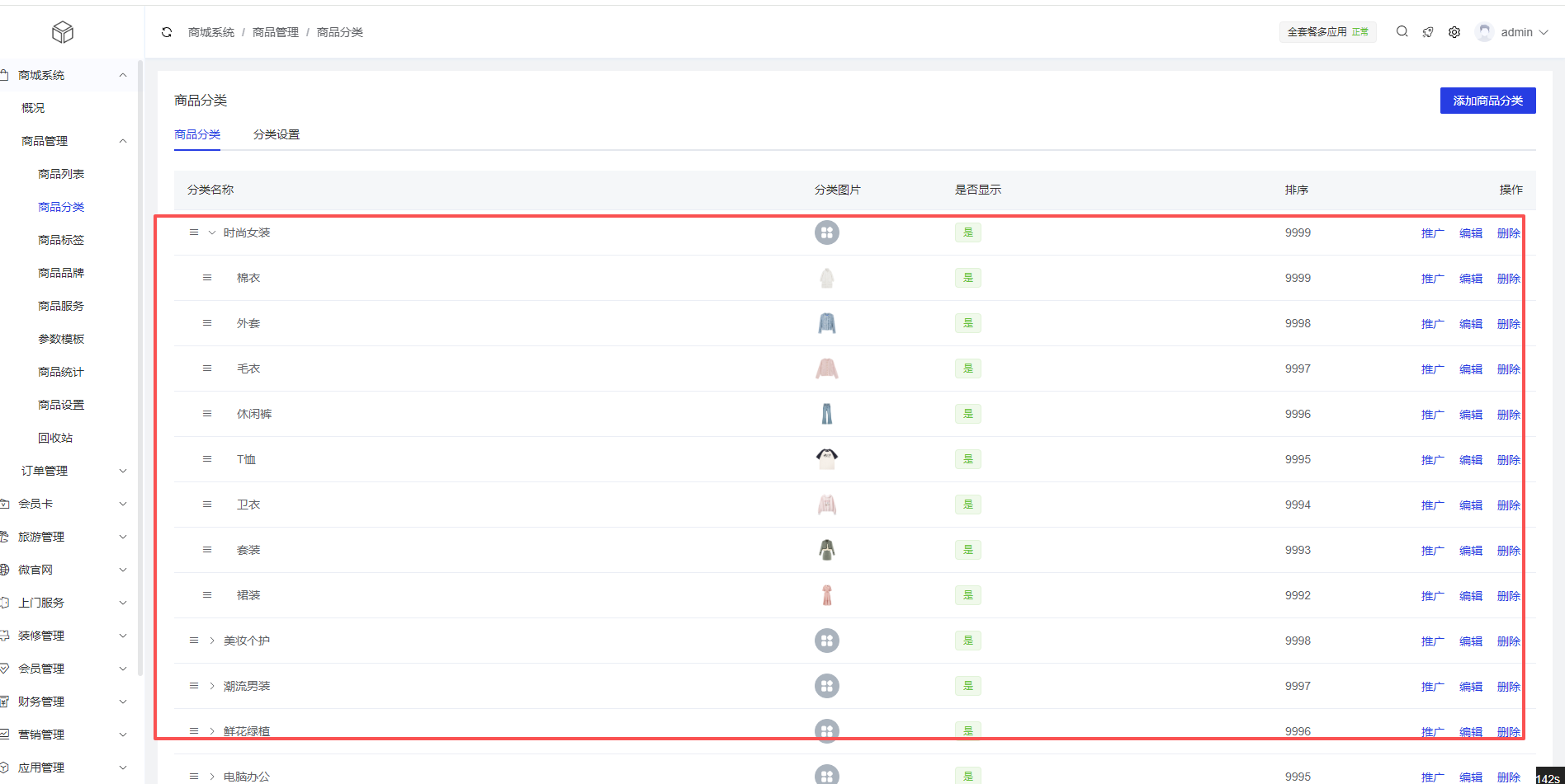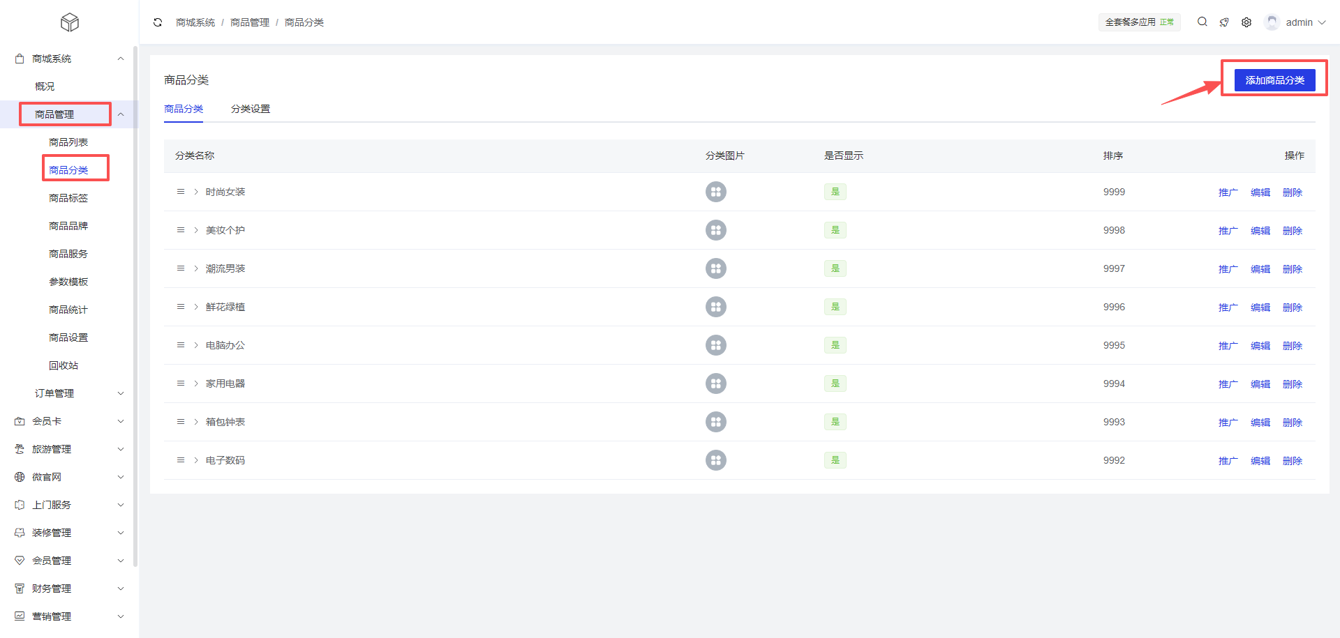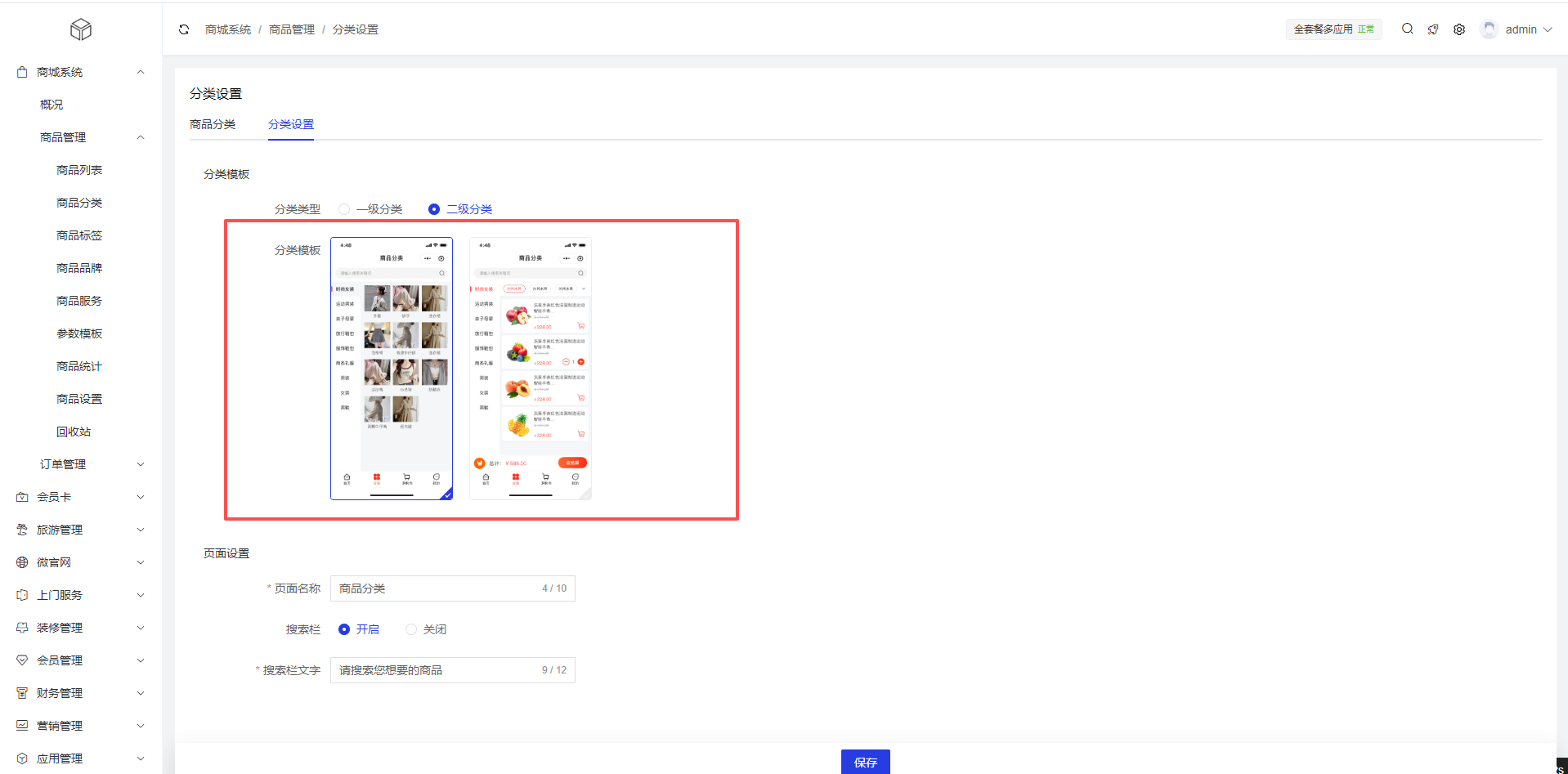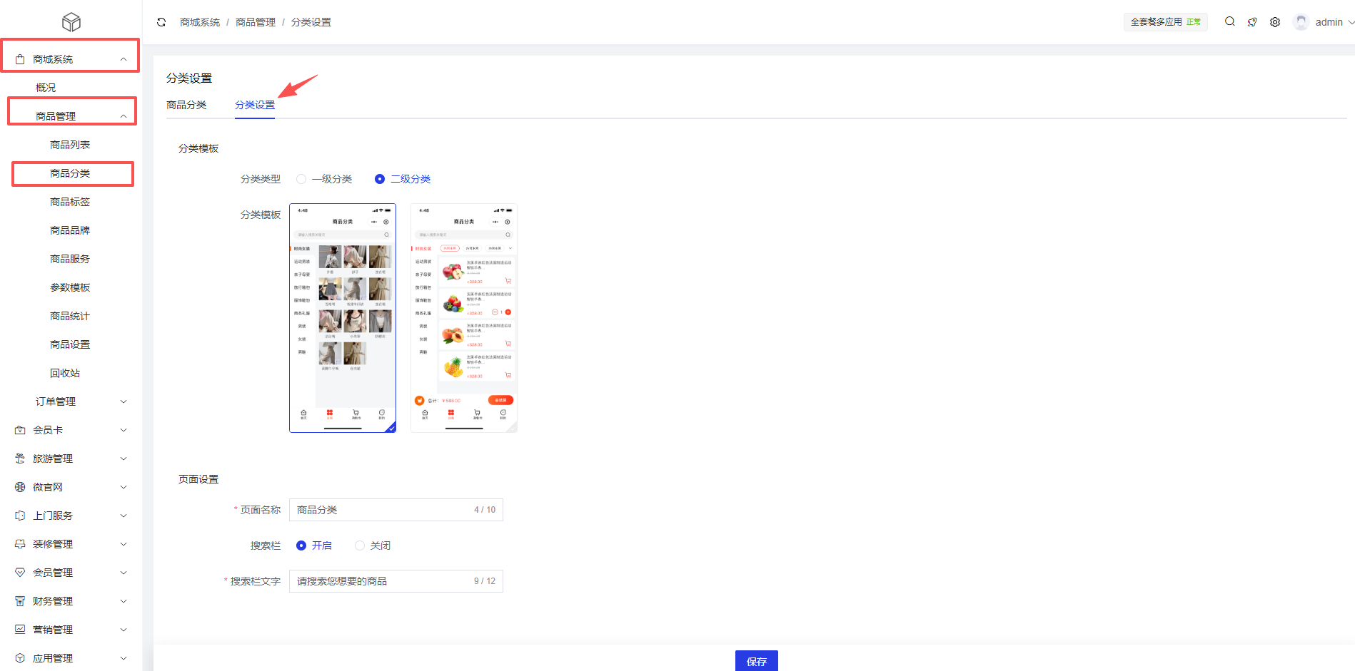 2、分类设置:商城系统 >商品管理 >商品分类 >分类设置