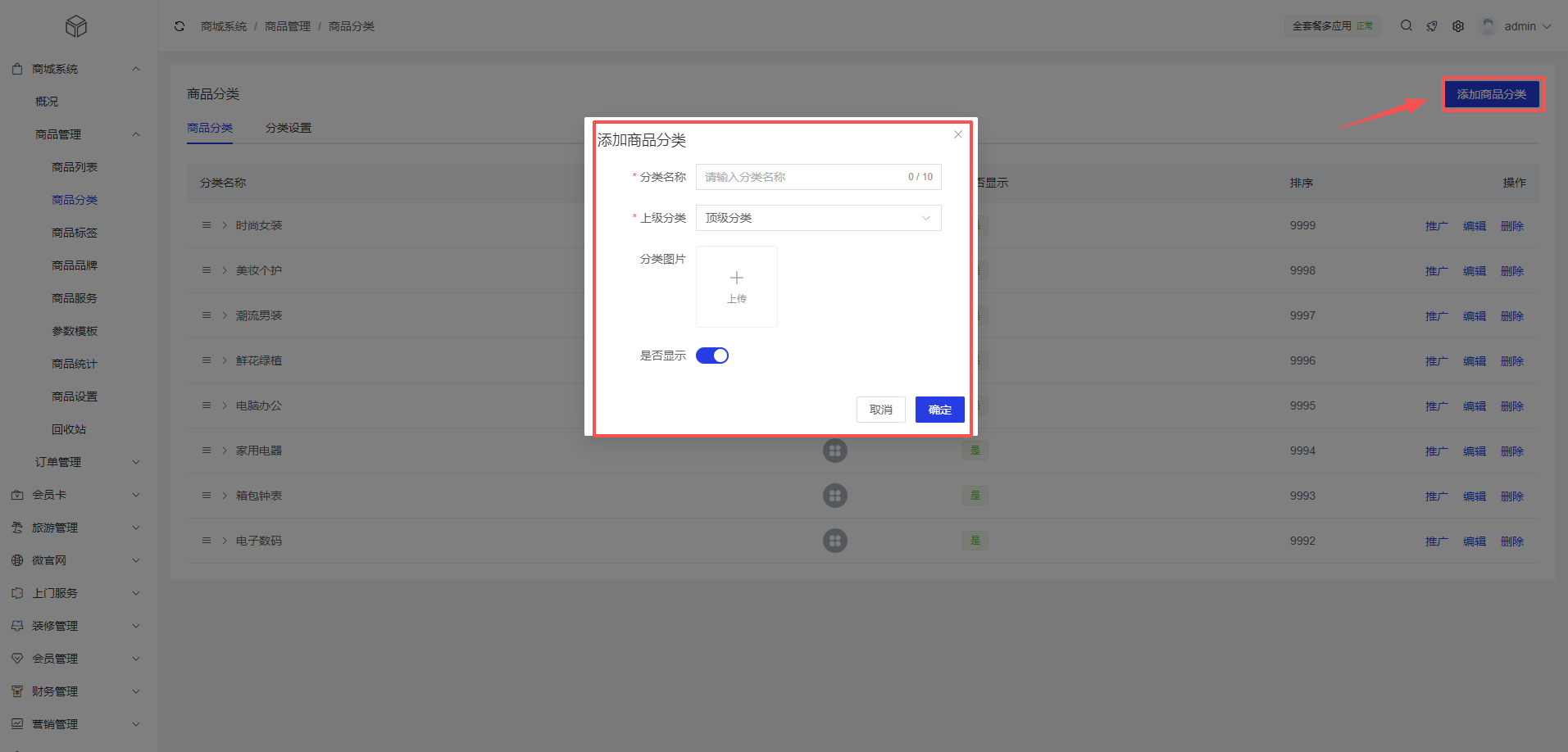 1、添加商品分类:商城系统 >商品管理 >商品分类 >添加商品分类